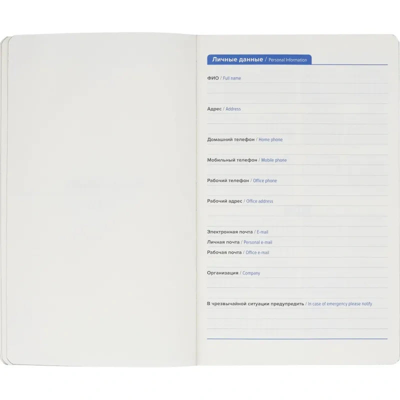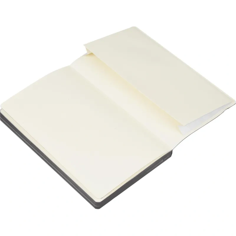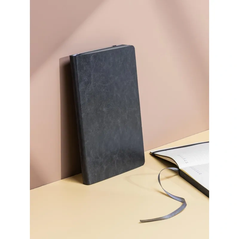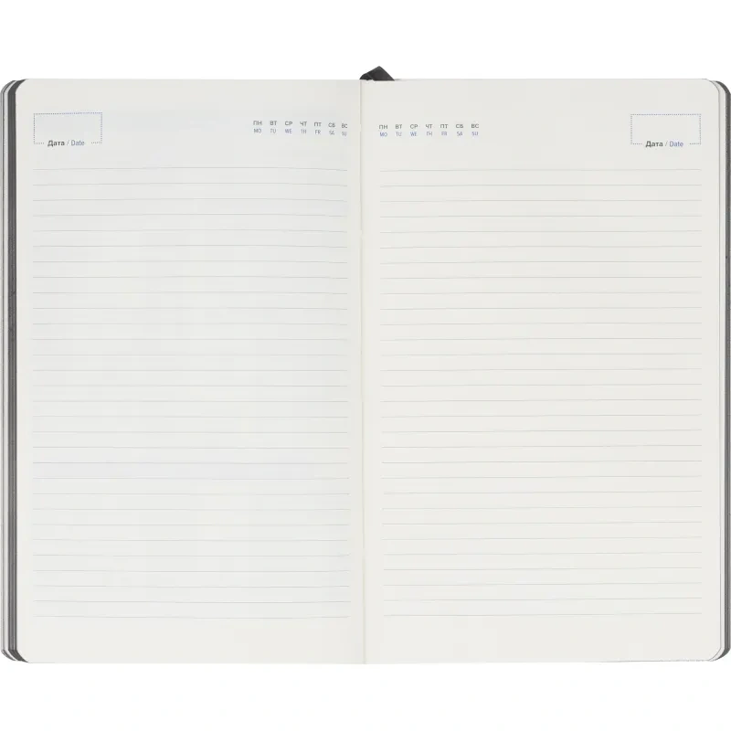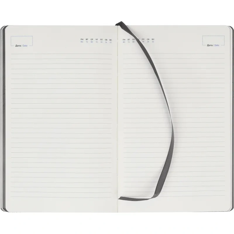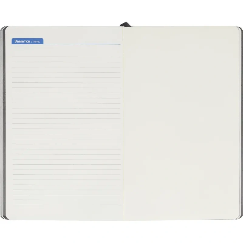 Обложка выполнена с отделкой Soft Touch, прошита, тип крепления — сшивка, что обеспечивает надёжность. Имеется ляссе серого цвета и скруглённые углы листов. В комплекте фиксирующая резинка для закрытия ежедневника и внутренний карман для документов. Петля для ручки отсутствует. Подарочная упаковка отсутствует.