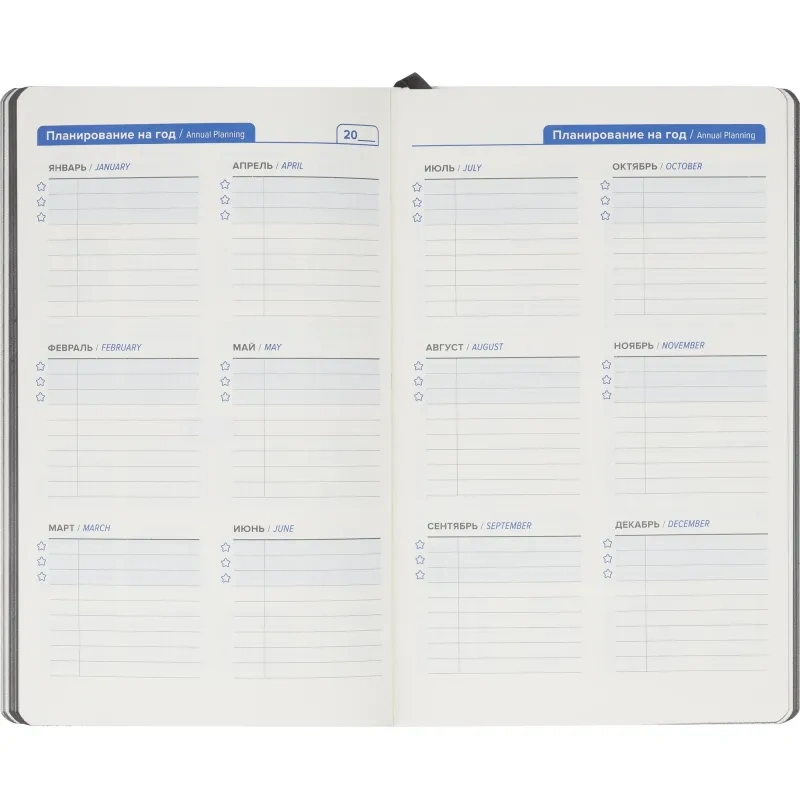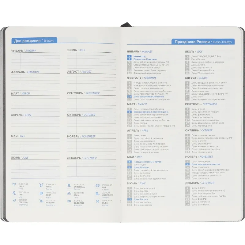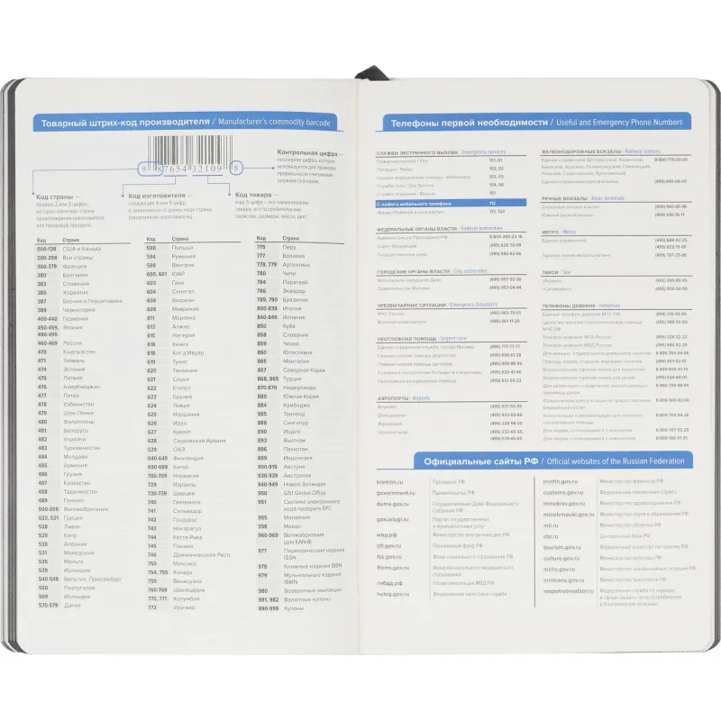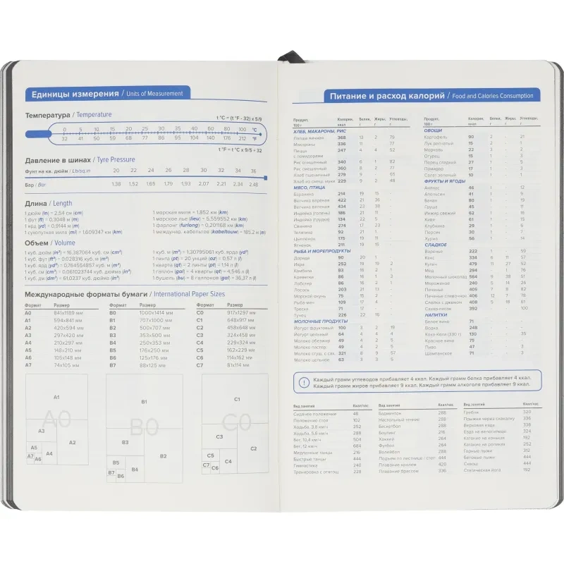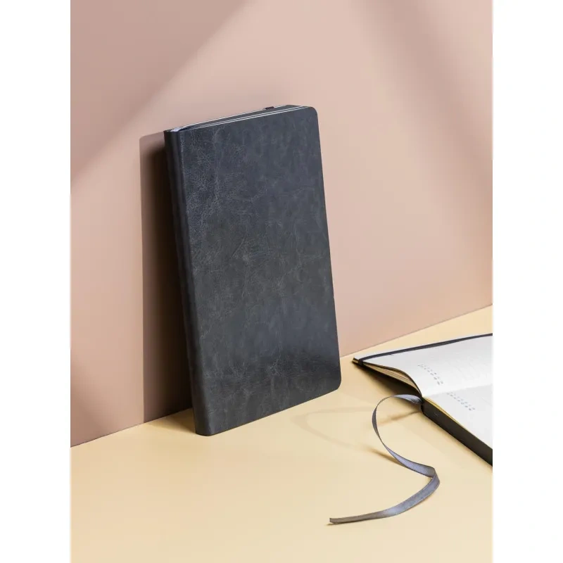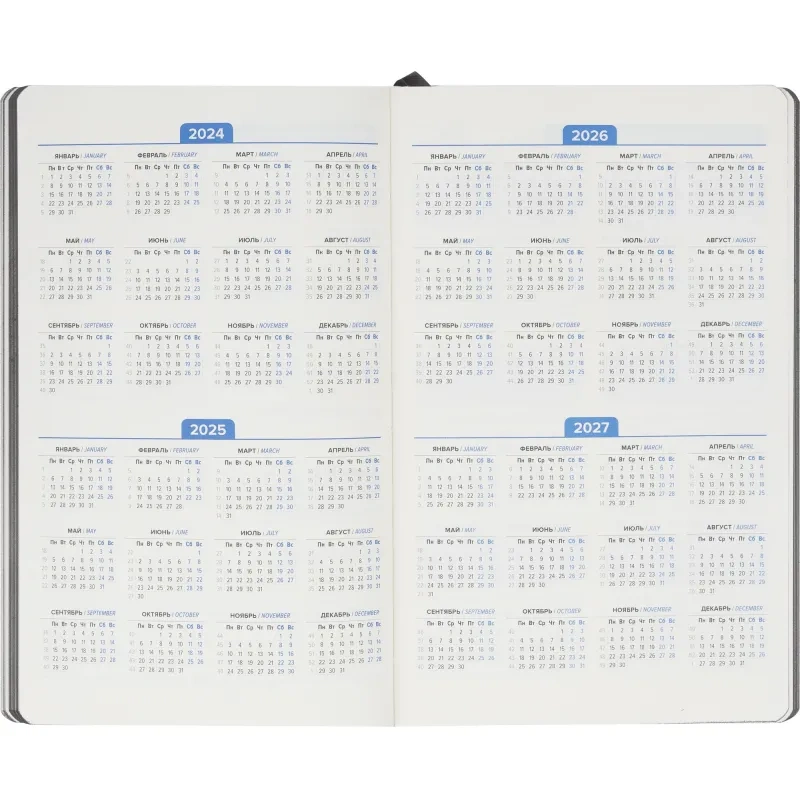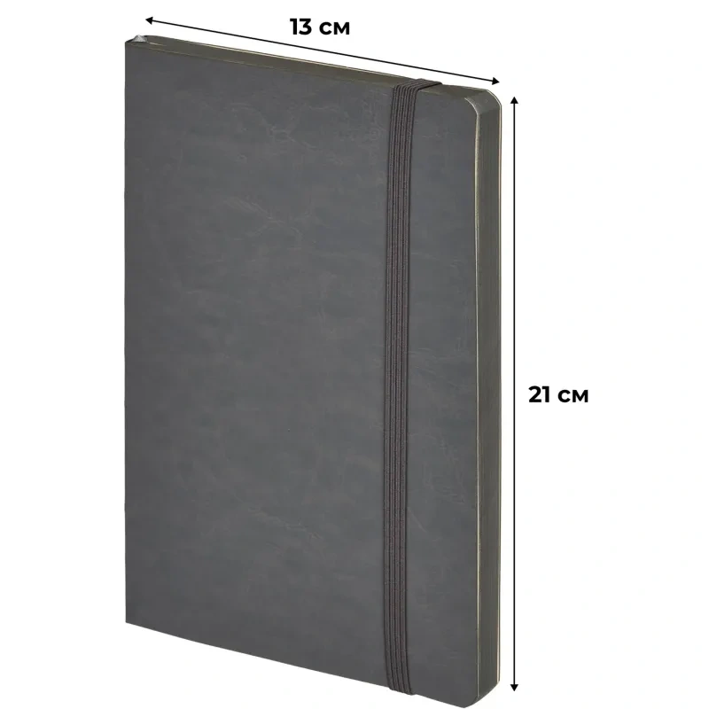 Недатированный ежедневник формата А5 размером 130×210 мм с мягкой обложкой из искусственной кожи серого цвета в универсальном офисном стиле. Внутренний блок содержит 272 страницы офсетной бумаги плотностью 70 г/кв.м. с линейной разметкой и печатью в две краски. Бумага бежевого цвета, с цветным серым обрезом. Включён календарь на 2024–2027 годы и информационно-справочный блок с праздниками России, единицами измерения, питанием и расходом калорий, товарным штрих-кодом производителя, телефонами первой необходимости и официальными сайтами РФ.