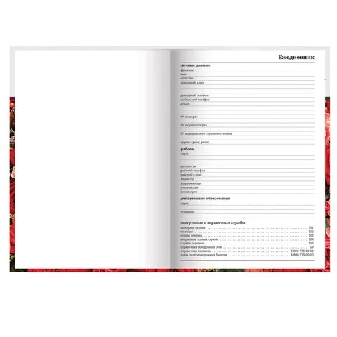 Недатированный ежедневник формата А5 с размерами 130x210 мм предназначен для ведения записей и планирования. Внутренний блок содержит 272 страницы из офсетной бумаги плотностью 70 г/кв.м., с линейной разметкой и печатью в две краски. Бумага бежевого цвета с цветным синим обрезом. Включен календарь на 2024-2027 годы и справочный блок с информацией о праздниках России, единицах измерения, питании и расходе калорий, товарном штрих-коде, телефонах экстренных служб и официальных сайтах.