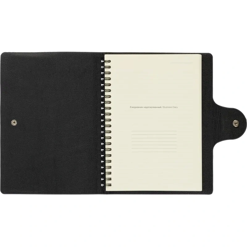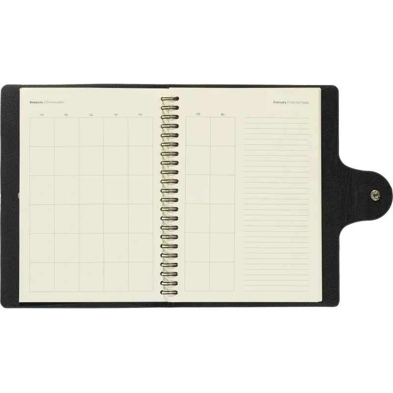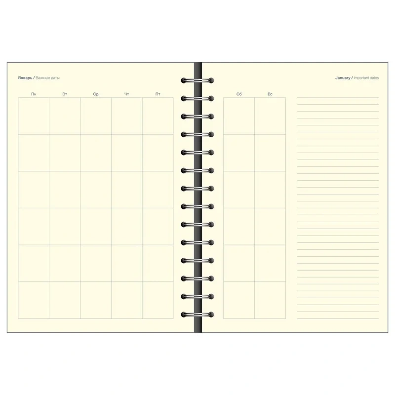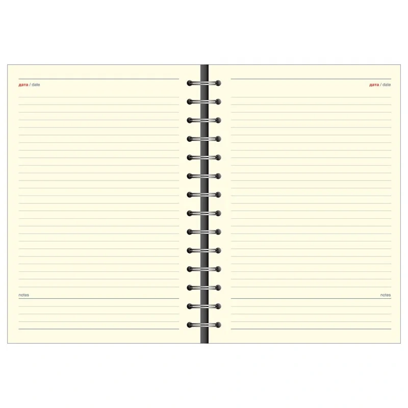 Внутренний блок состоит из 96 листов (192 страницы) высококачественной бумаги цвета слоновой кости плотностью 70-90 г/кв.м. с прямыми уголками и линовкой в линейку. В ежедневнике предусмотрен информационный блок с титульным листом, планером на каждый месяц и разворотами для заметок в начале и конце блока.
