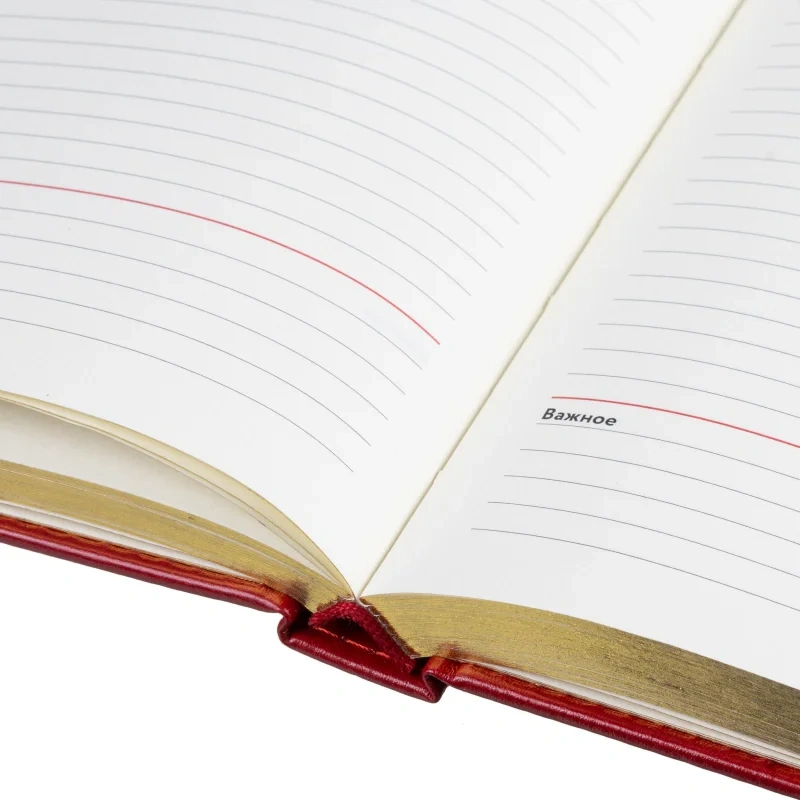 Внутренний блок включает 160 листов тонированной офсетной бумаги плотностью 80 г/кв.м. Страницы оформлены в линейку и напечатаны в две краски. Вырубка блока и перфорация уголков упрощают навигацию, а скруглённые углы повышают комфорт при перелистывании. Золотистый обрез подчёркивает презентабельный внешний вид изделия.