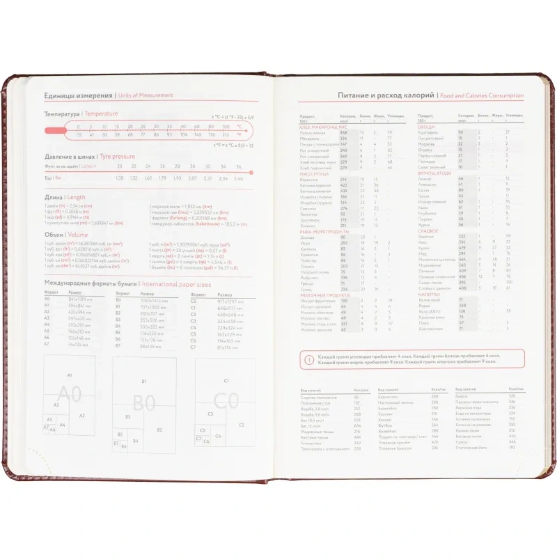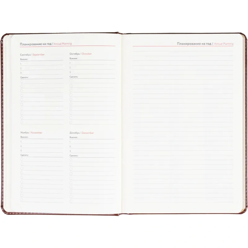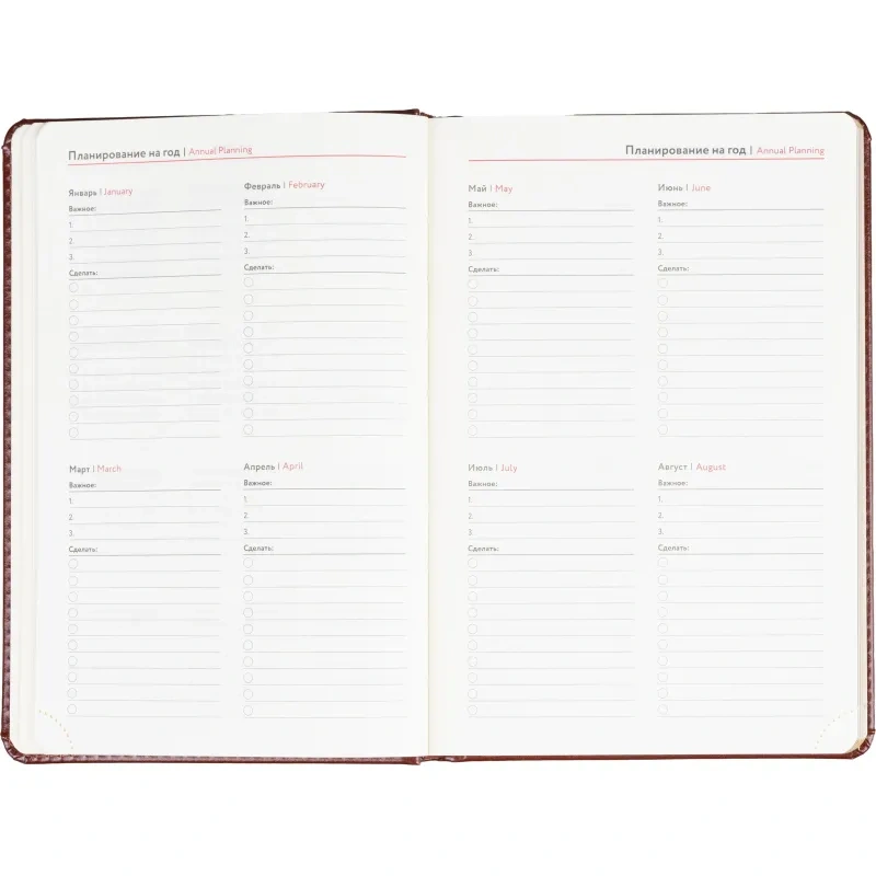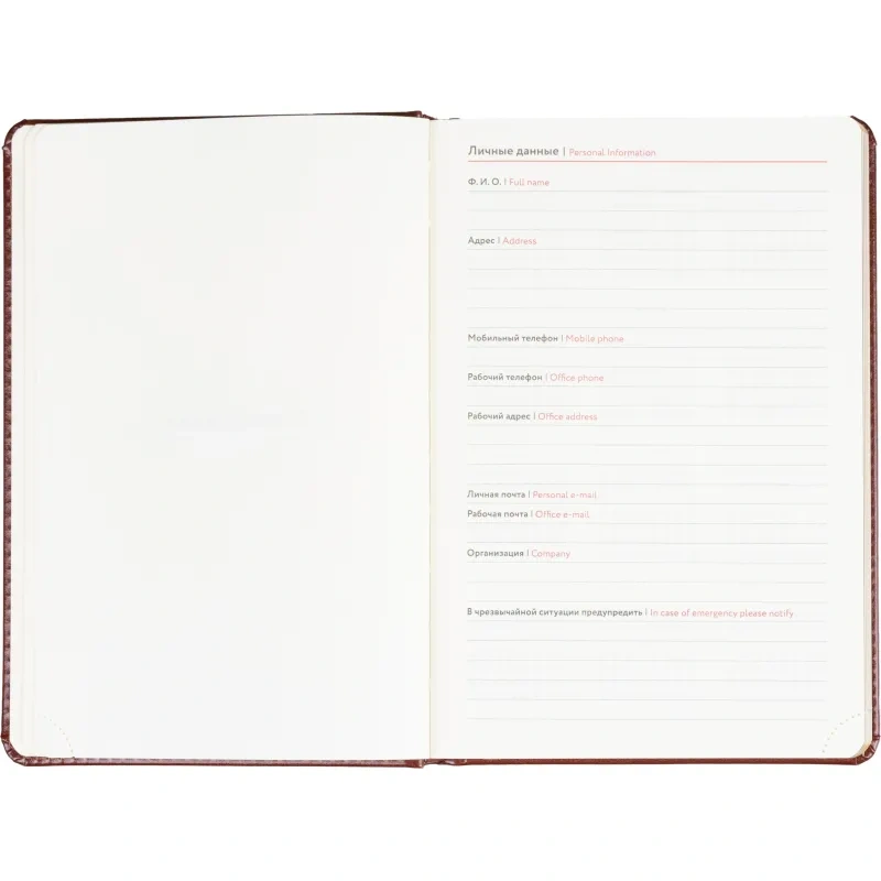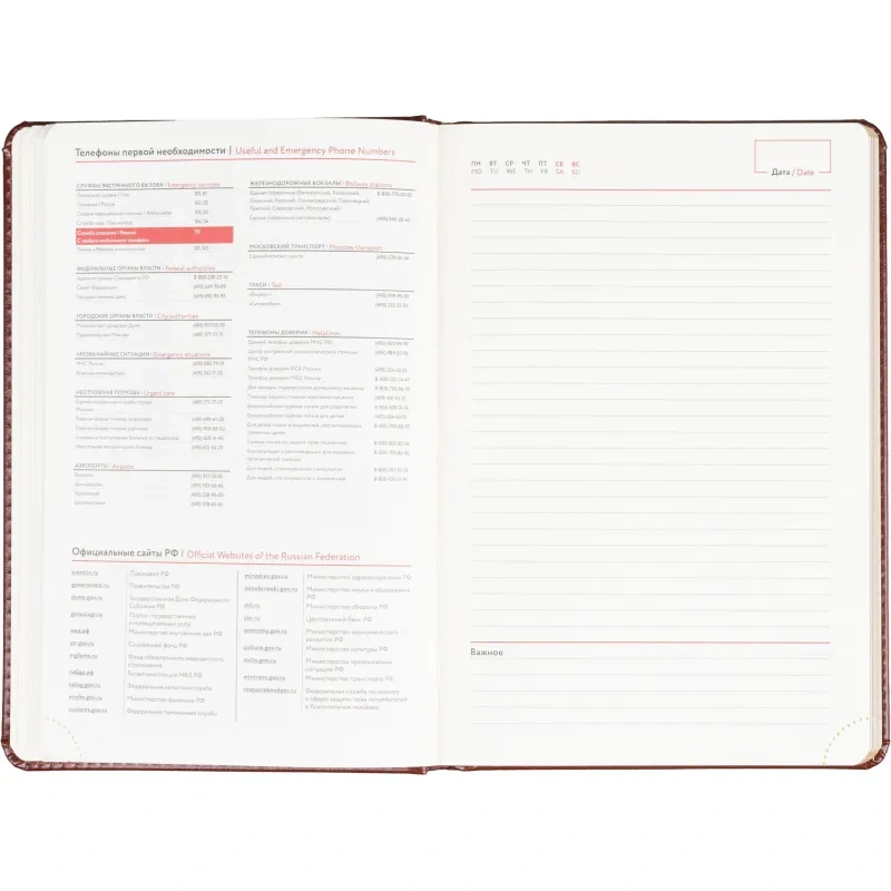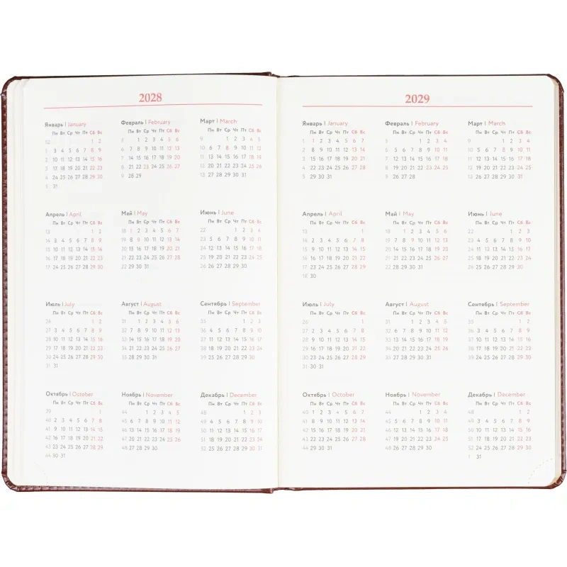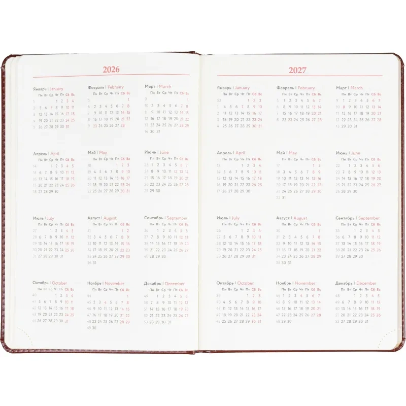 Размер изделия — 14.5×21.5 см. Внутри размещён календарь на два года. Ежедневник подходит под персонализацию.