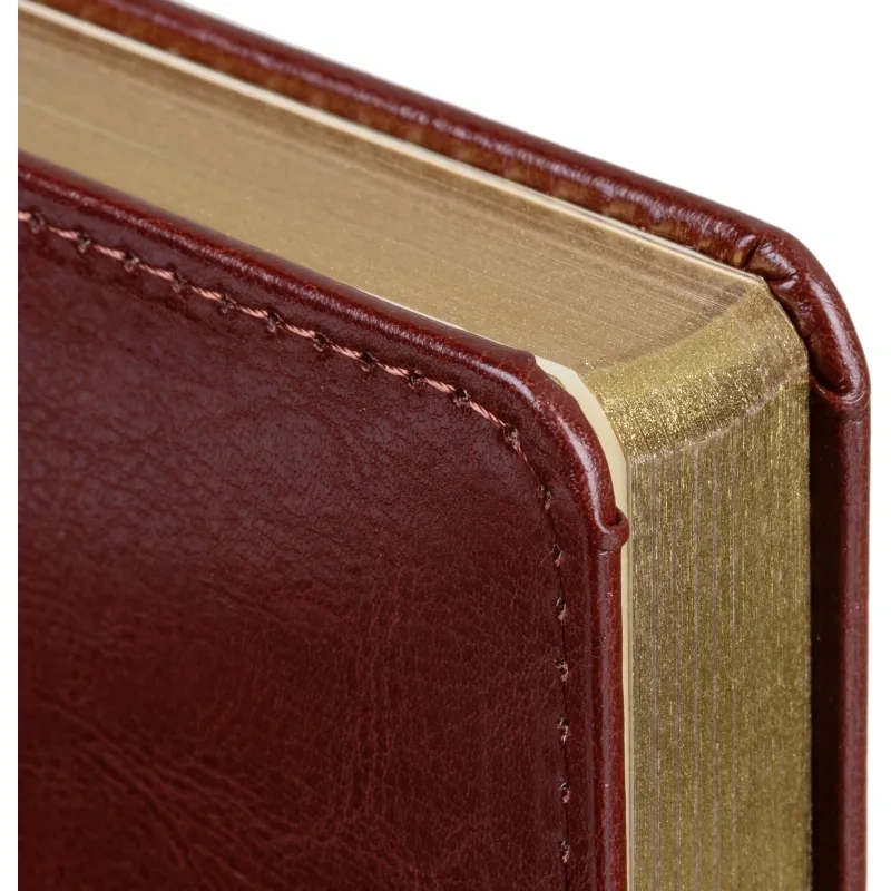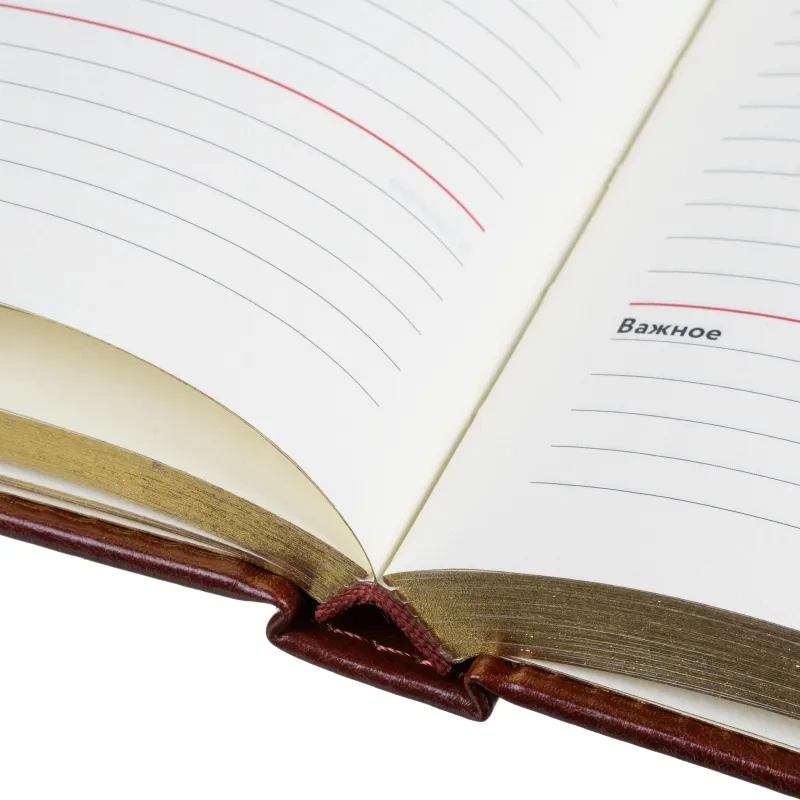 Внутренний блок включает 160 листов тонированной офсетной бумаги плотностью 80 г/кв.м. Страницы напечатаны в две краски и размечены в линейку. Перфорация уголков и вырубка блока облегчают навигацию. Скруглённые углы листов обеспечивают комфорт при перелистывании. Золотистый обрез придаёт ежедневнику выразительный и аккуратный внешний вид.