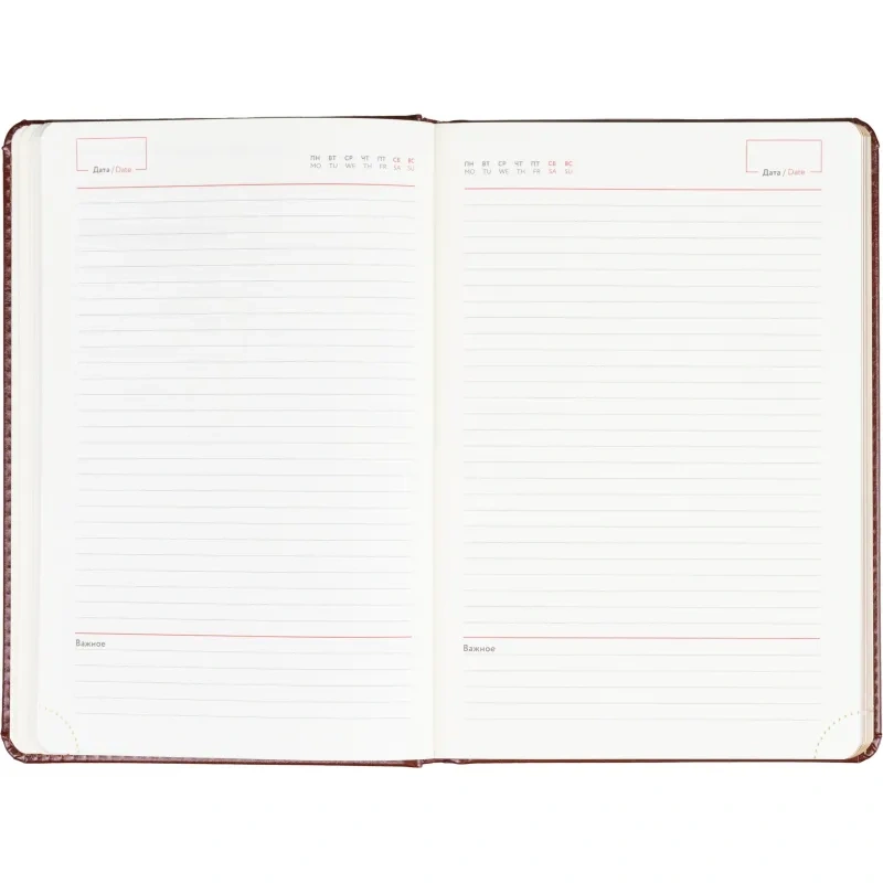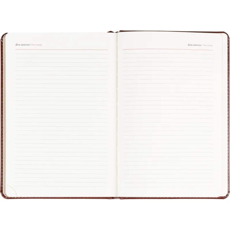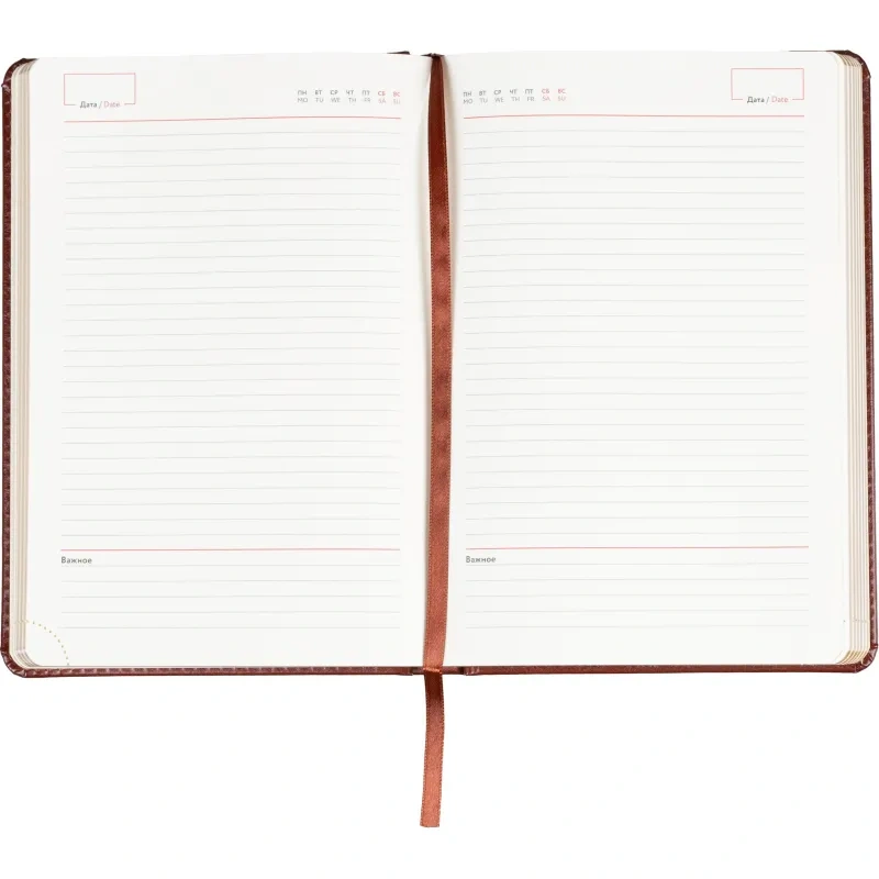 Ежедневник формата A5 предназначен для ведения записей, планов и заметок без указания дат. Обложка выполнена из искусственной кожи коричневого цвета с тиснением и оформлена в однотонном стиле. Твёрдый переплёт сохраняет форму изделия, а сшивка блока обеспечивает прочность при повседневном использовании.