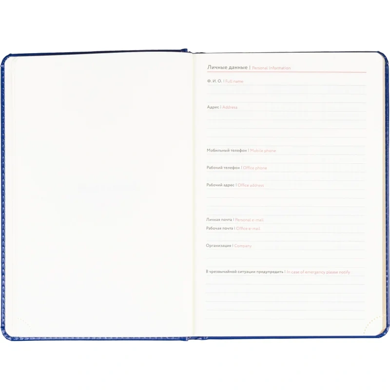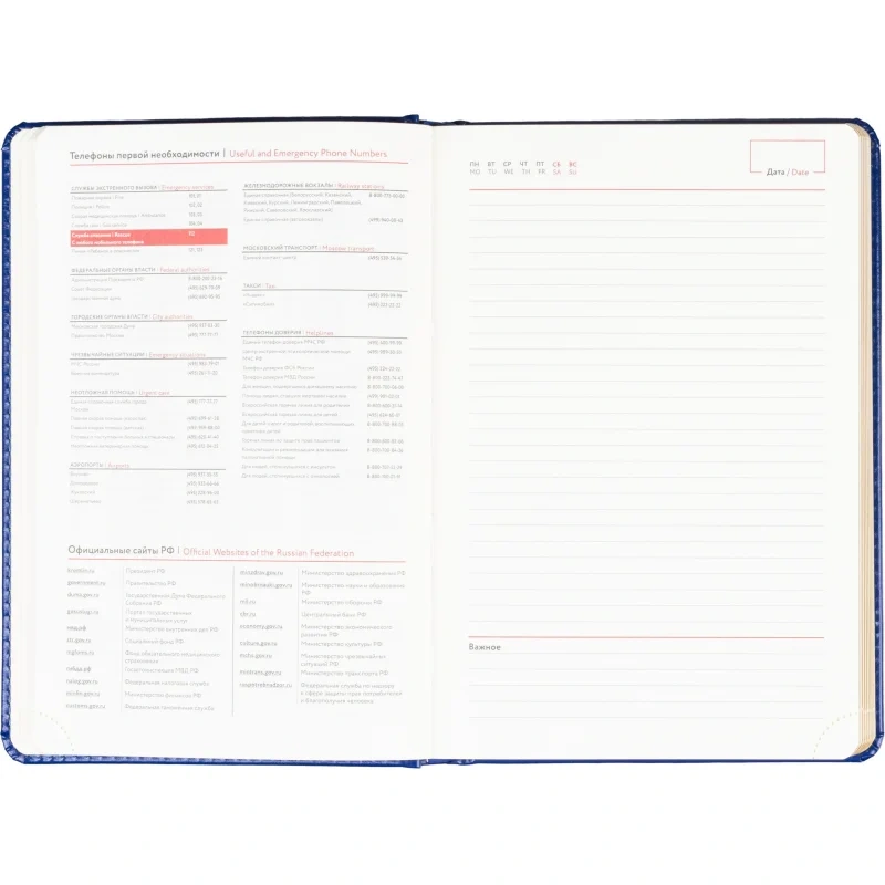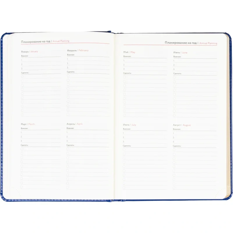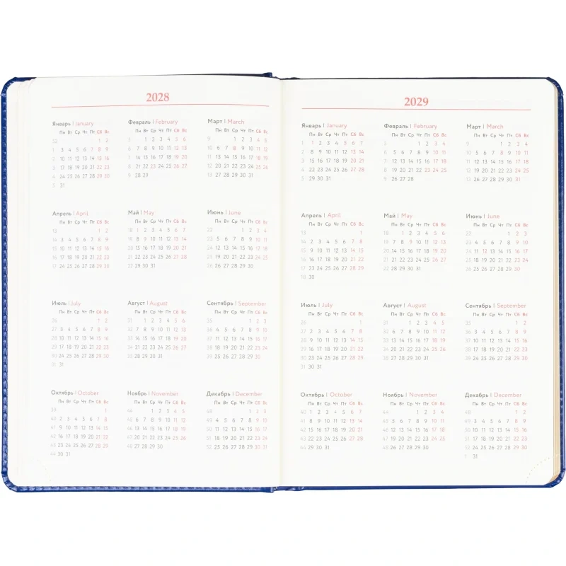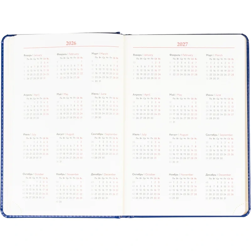 Размер изделия — 14.5×21.5 см. Внутри размещён календарь на два года. Ежедневник подходит под персонализацию.