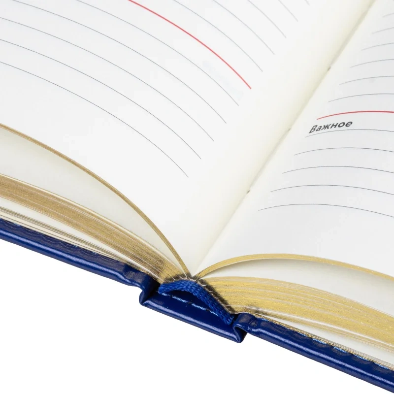 Внутренний блок включает 160 листов тонированной офсетной бумаги плотностью 80 г/кв.м. Страницы размечены в линейку и напечатаны в две краски. Перфорация уголков и вырубка блока делают навигацию по страницам более удобной. Скруглённые углы повышают комфорт при перелистывании. Золотистый обрез придаёт ежедневнику элегантный и аккуратный внешний вид.