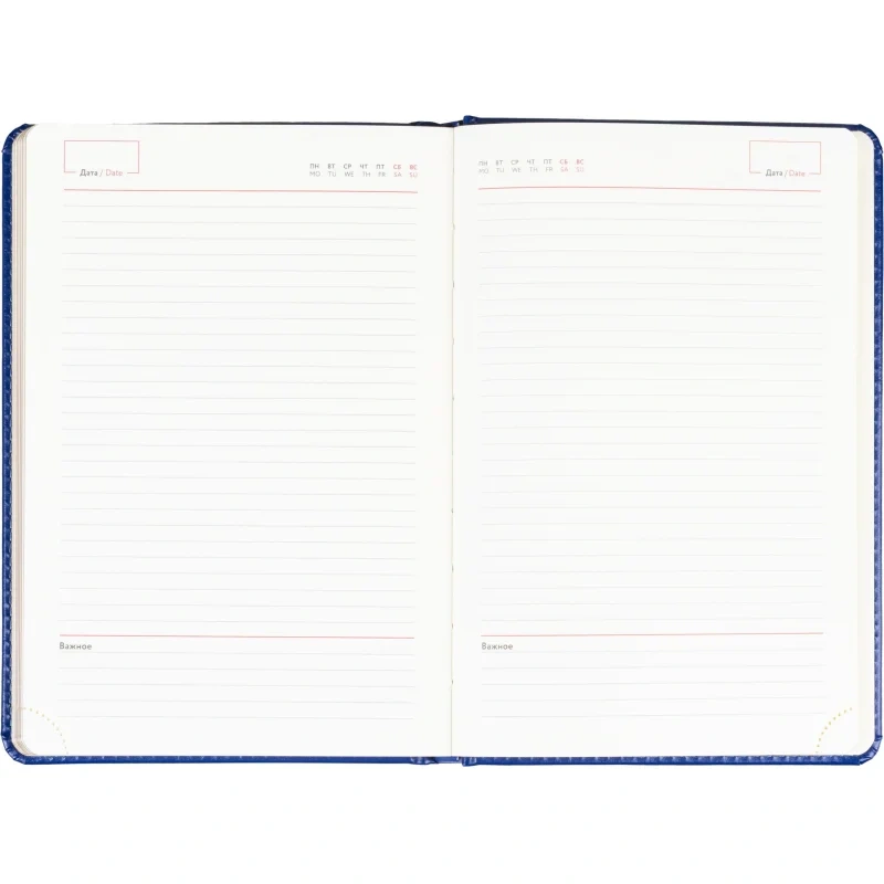 Ежедневник формата A5 предназначен для планирования и записей без указания дат. Обложка выполнена из искусственной кожи голубого цвета с тиснением и оформлена в однотонном стиле. Твёрдый переплёт обеспечивает устойчивость формы, а сшивка блока гарантирует долговечность при регулярном использовании.