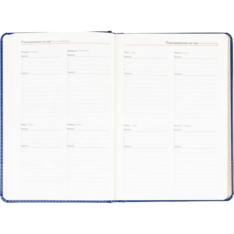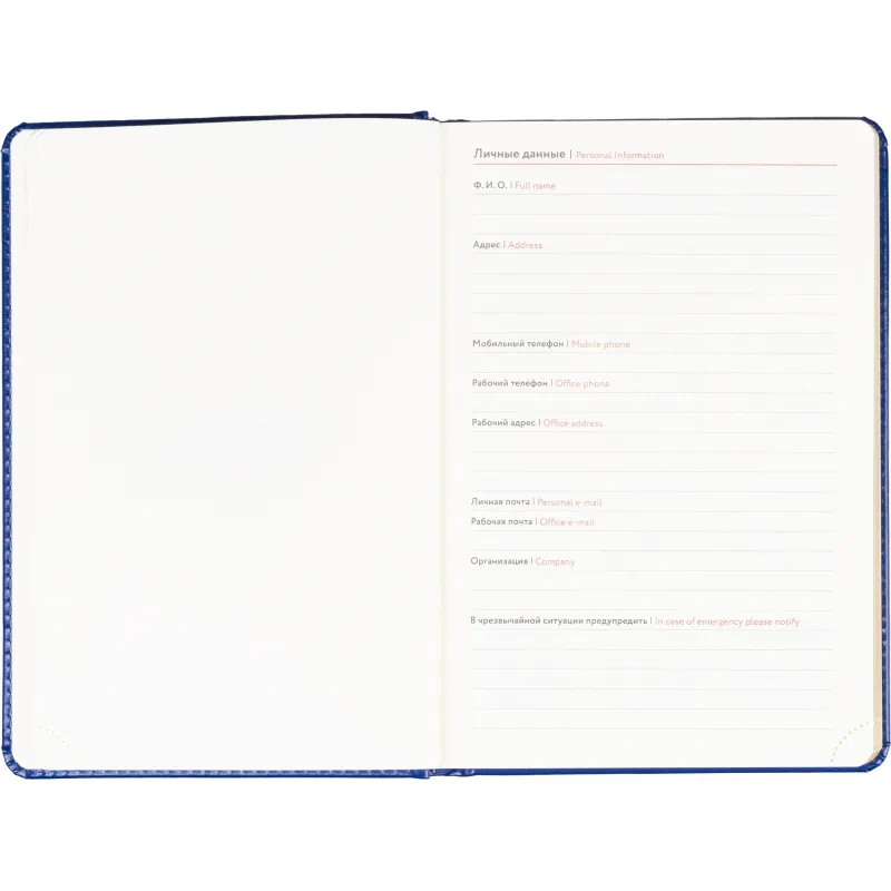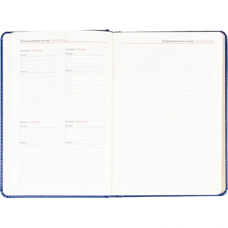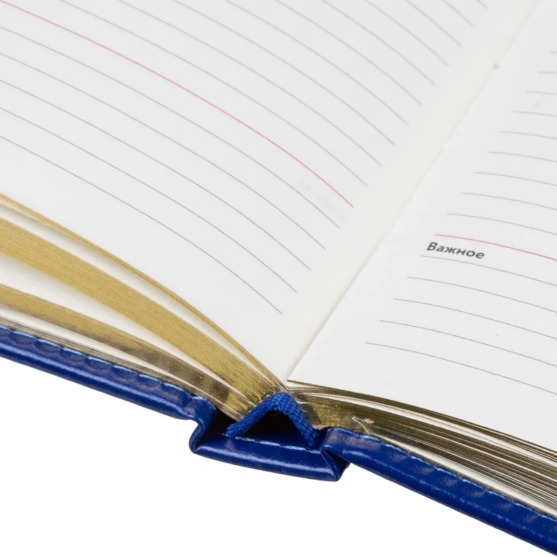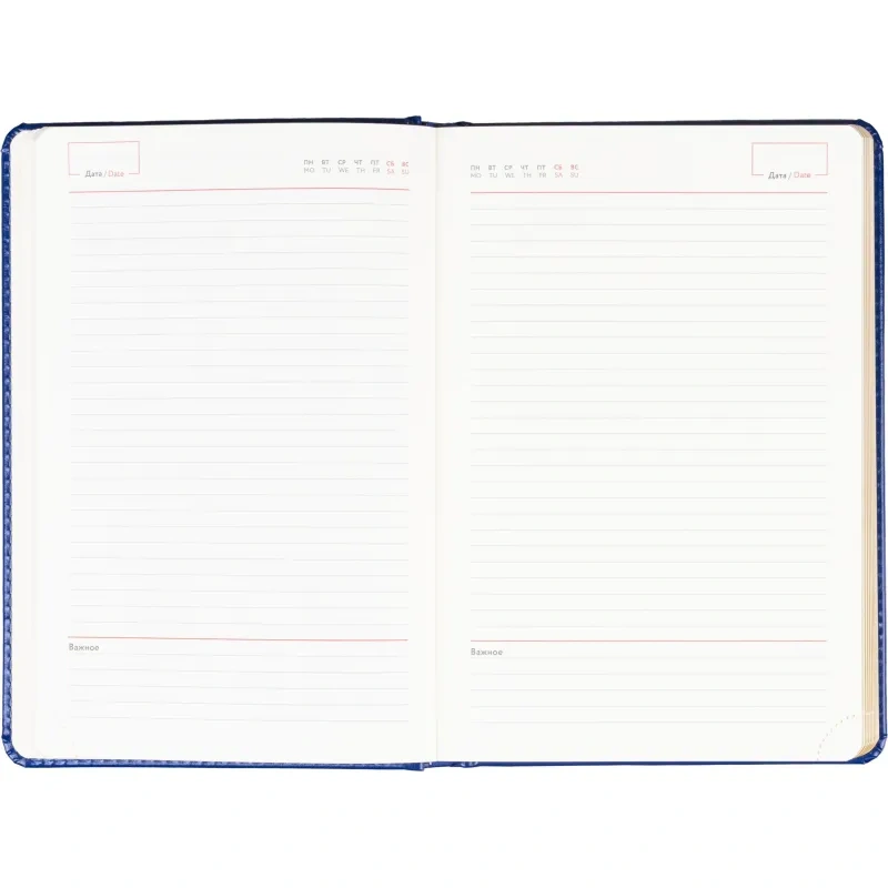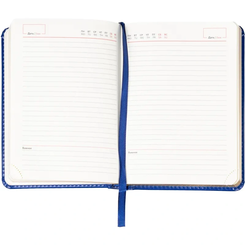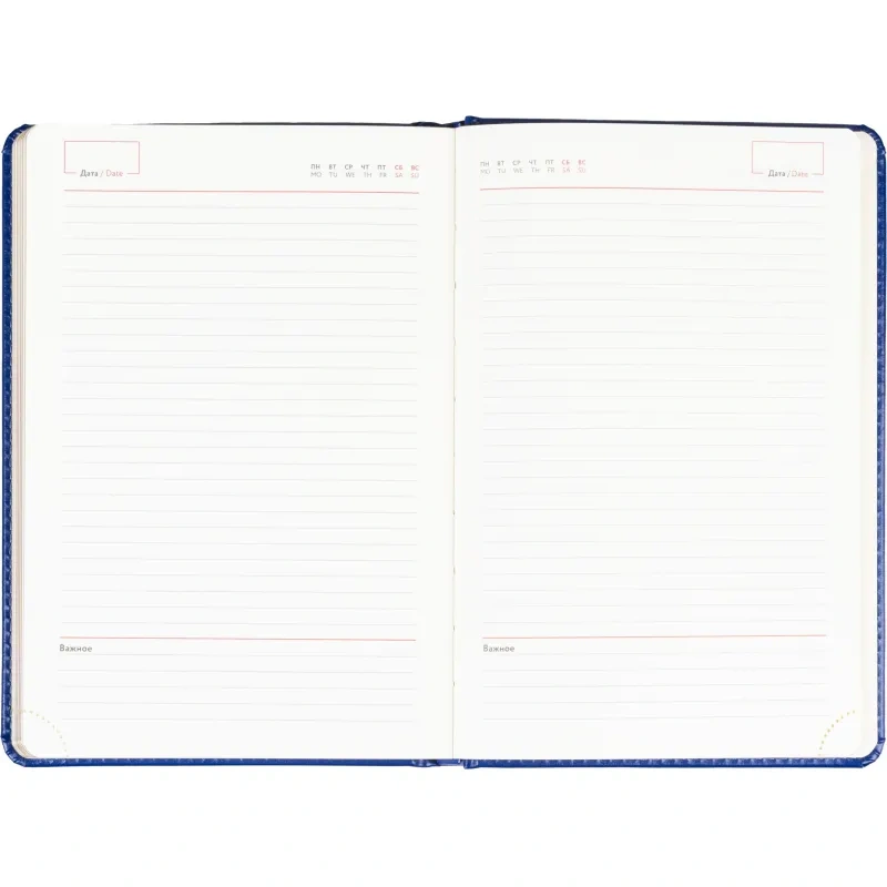 Ежедневник формата A6 предназначен для компактных записей и заметок без привязки к датам. Обложка выполнена из искусственной кожи голубого цвета с тиснением и оформлена в однотонном стиле. Твёрдый переплёт придаёт изделию устойчивость, а сшивка внутреннего блока обеспечивает прочность при повседневном использовании.