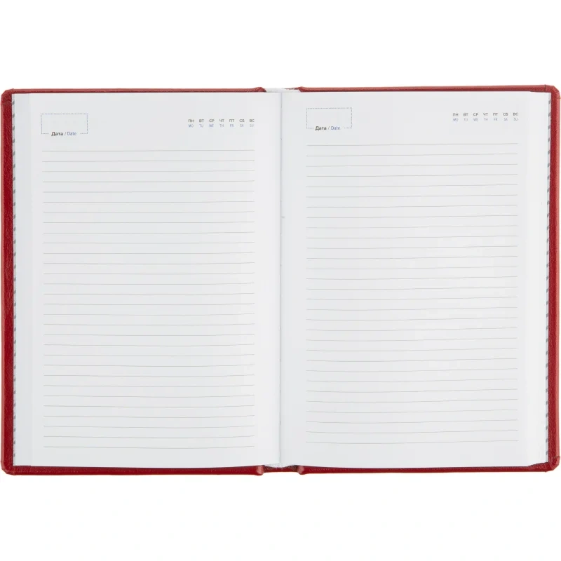 Еженедельник А5 недатированный, цвет красный 150x213мм, ляссе белого цвета, 160 листов, белый блок с печатью в2 краски, календарь на 2024-2027 гг. Обложка выполнена из натуральной кожи серии 'Галант' Имеет повышенную износостойкость, однородную фактуру, прекрасную органолептику, споролоном. Блок: офсет 80 г/м2 (линейка). Содержитинформационно-справочныйблок- праздники России, международные коды городов России, цифровые коды ГИБДД, справочник неметрических единиц и перевод в метрические, размеры одежды. Вставка- алфавитный блок без вырубки. Нет петли под ручку. Поставляется в термоусадочной пленке.