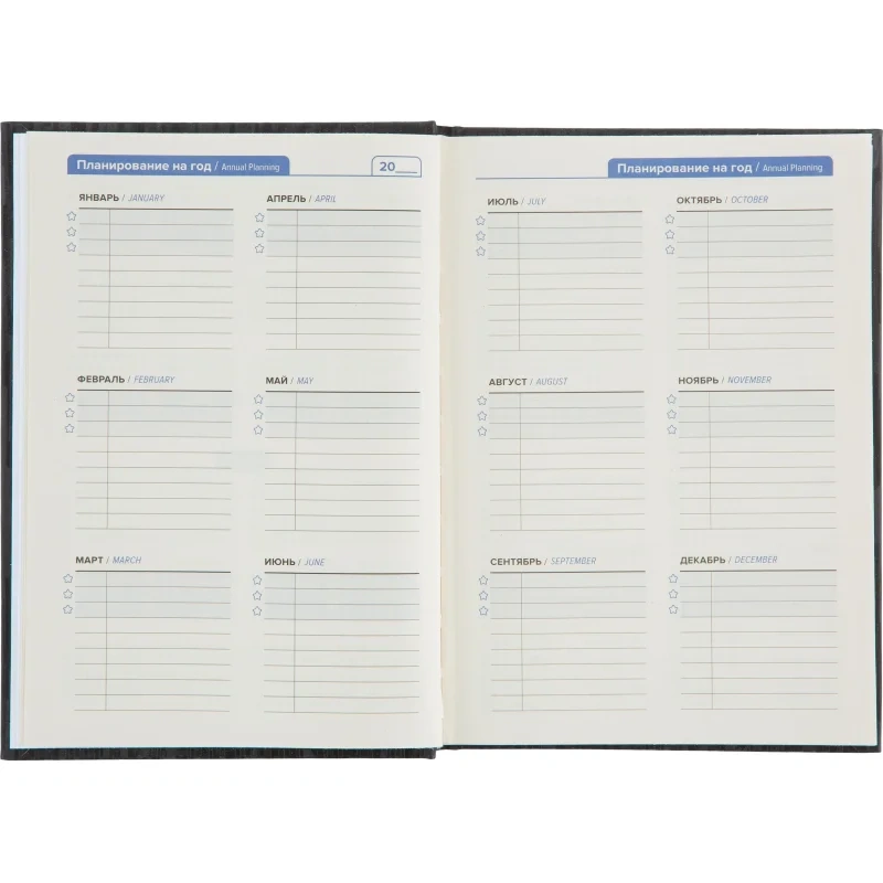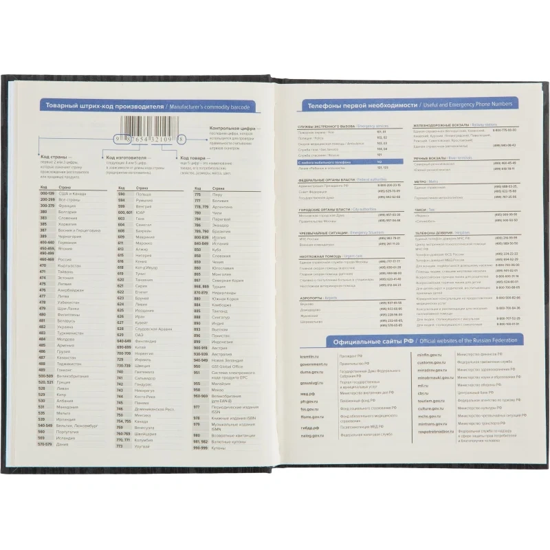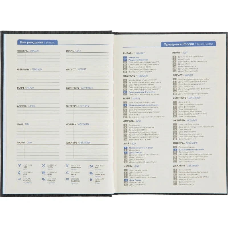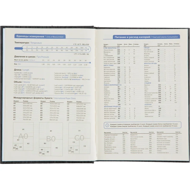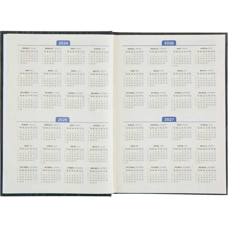 Внутренний блок включает 352 страницы тонированной офсетной бумаги плотностью 55 г/кв.м, разлинованной в линейку и надёжно прошитой. В ежедневнике предусмотрен информационно-справочный раздел с перечнем праздников России, международными кодами городов, цифровыми кодами ГИБДД, справочником неметрических единиц с переводом в метрические, а также таблицей размеров одежды. Для удобства навигации предусмотрено ляссе. Календарь охватывает 2024–2027 годы. Поставляется в термоусадочной плёнке.
