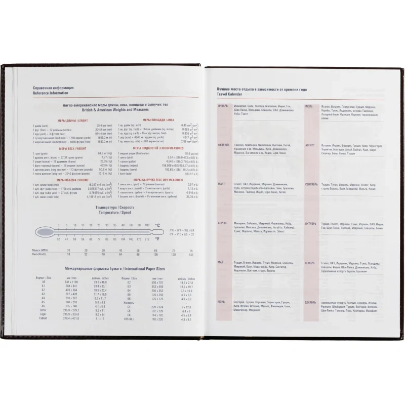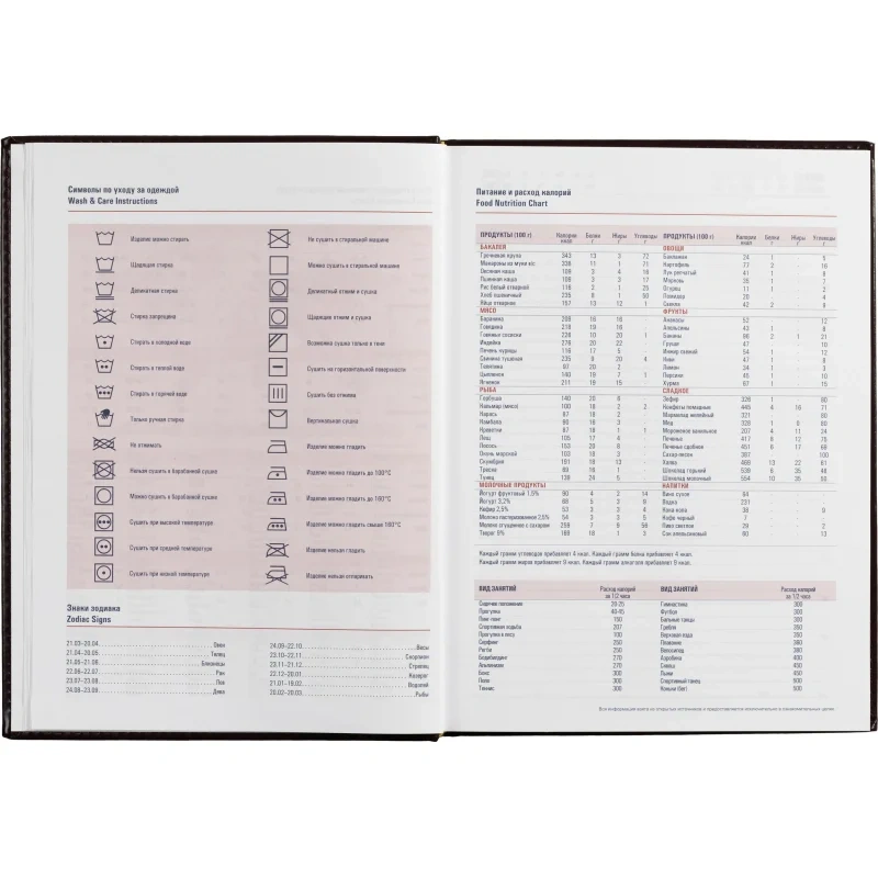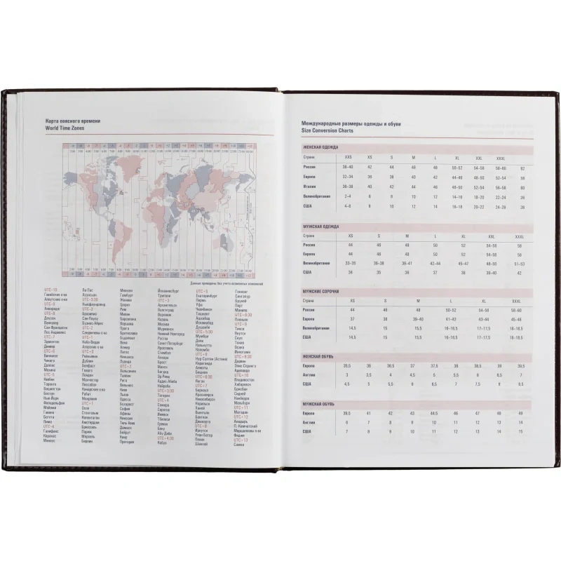 Изделие содержит телефонную книгу и информационно-справочный блок, включающий телефоны первой необходимости, международные коды городов России и мира, расстояния между городами Европы и СНГ, размеры одежды, штриховой код, знаки зодиака, доменные зоны мира, карту поясного времени, данные о питании и расходе калорий, неметрические единицы и форматы бумаги.