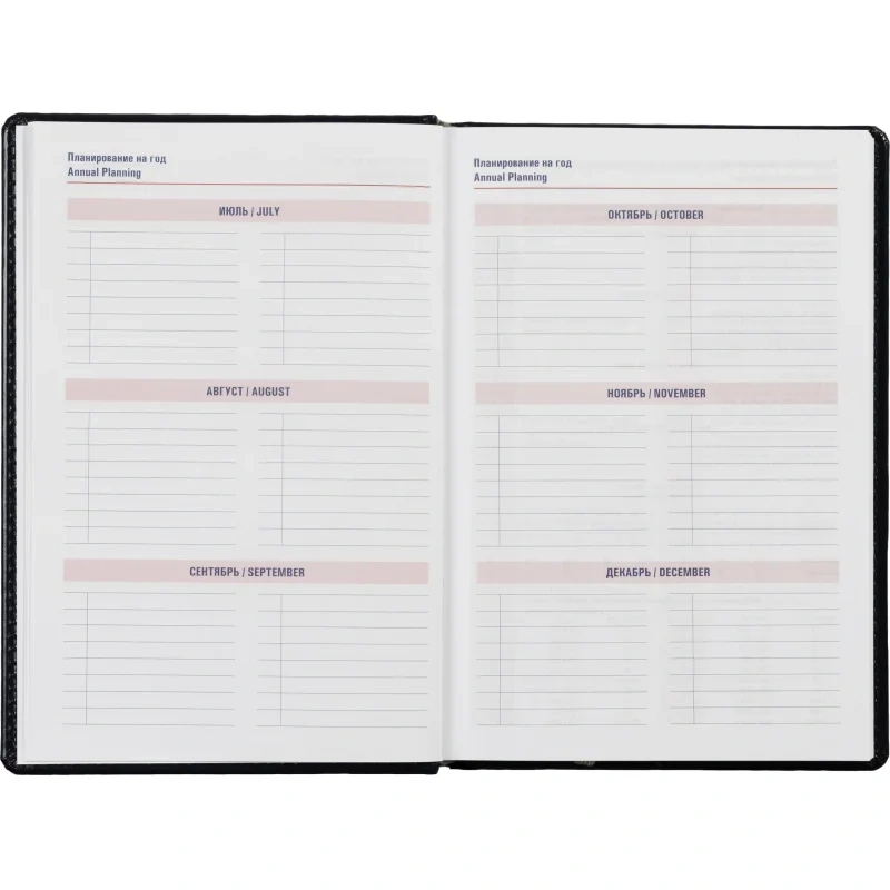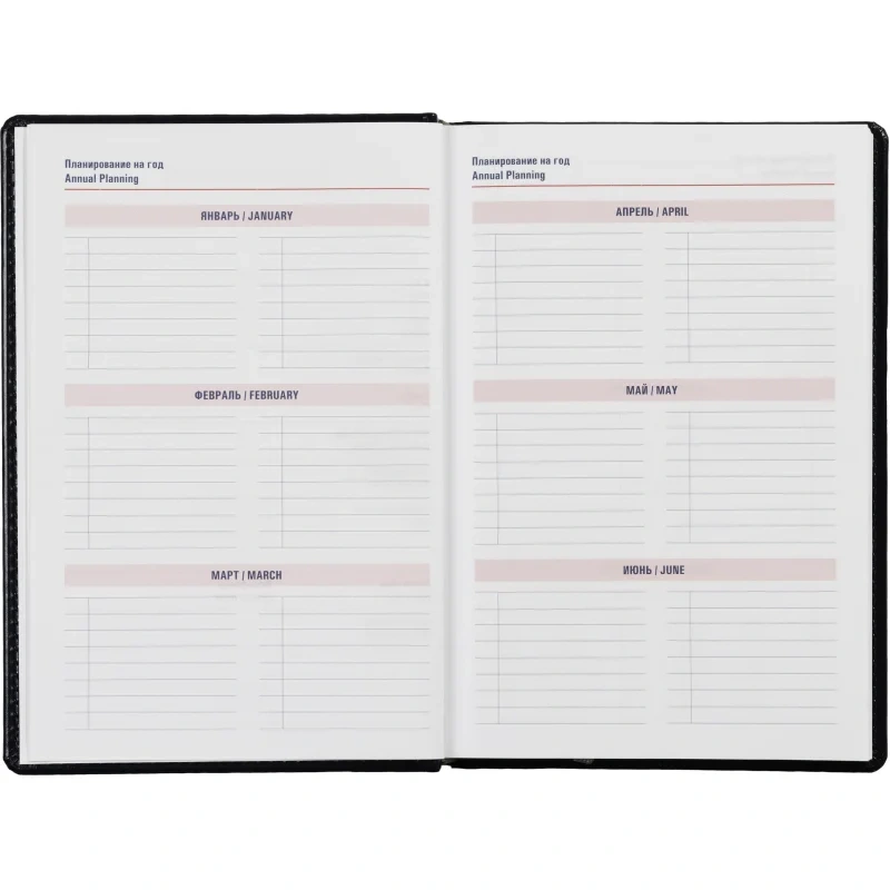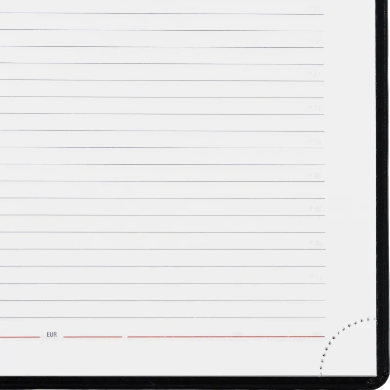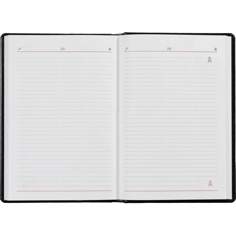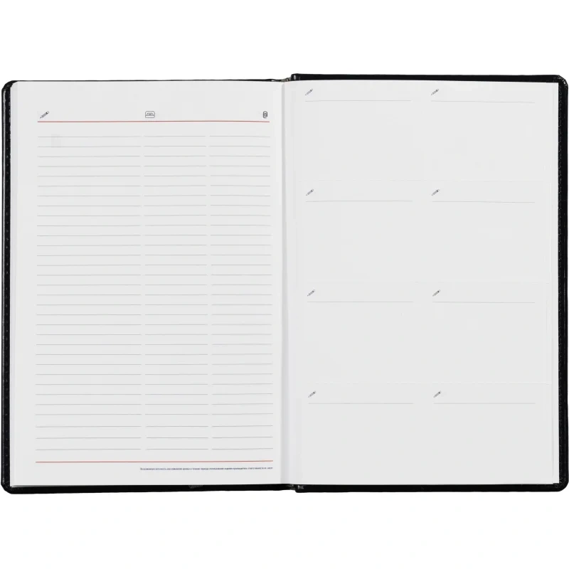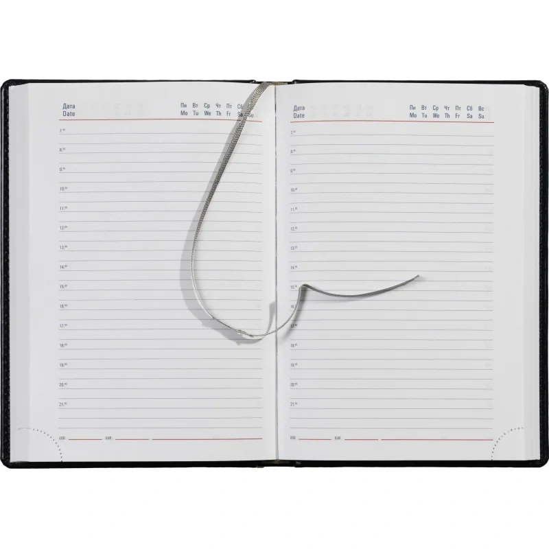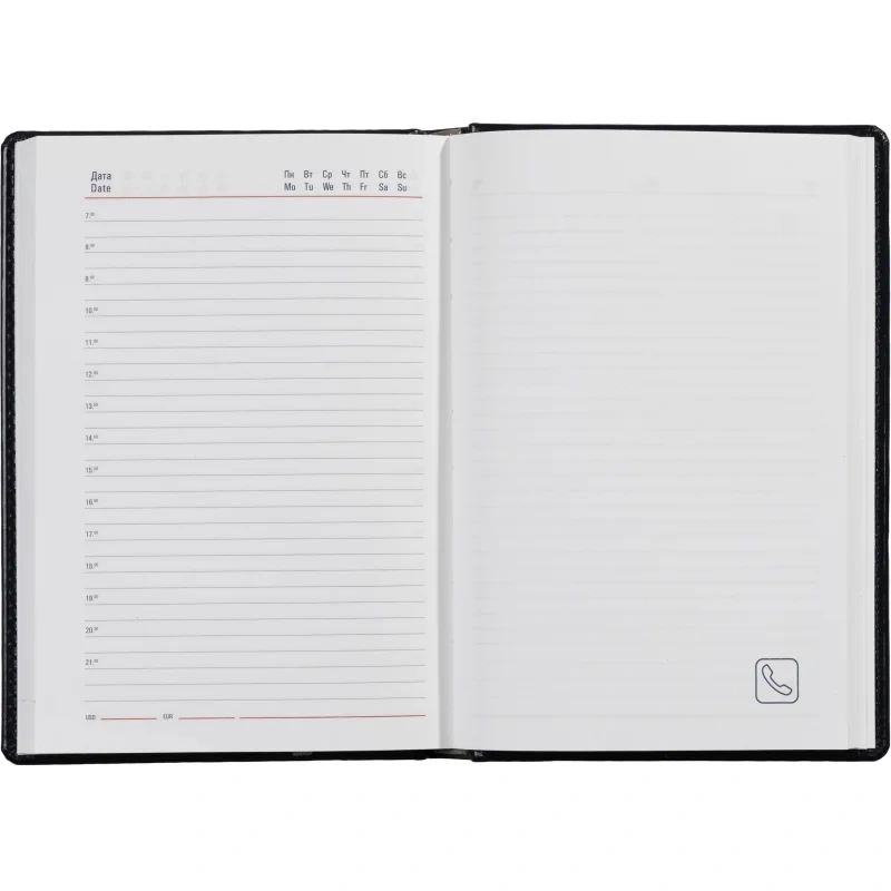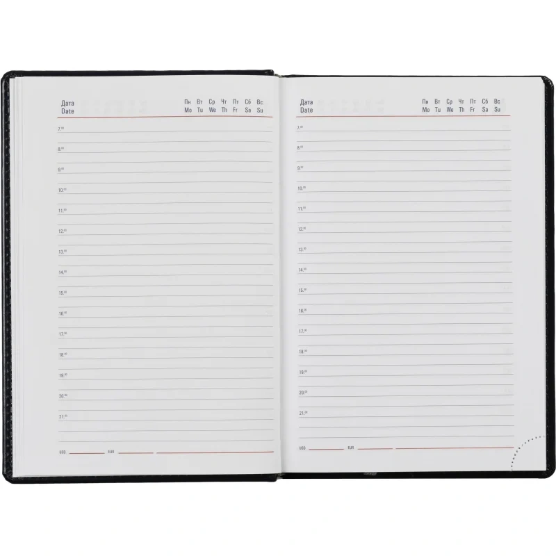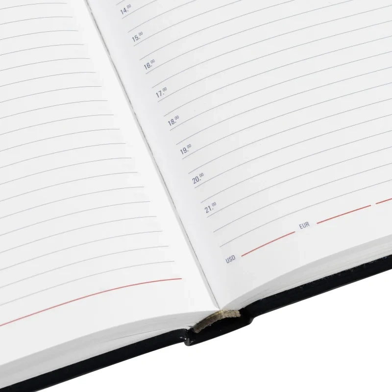 Внутренний блок состоит из 176 листов белой офсетной бумаги плотностью 90 г/кв.м. Листы с линейкой напечатаны в две краски. На каждую страницу приходится один день недели. Ежедневник оснащён закладкой-ляссе и перфорацией уголков для удобства использования.