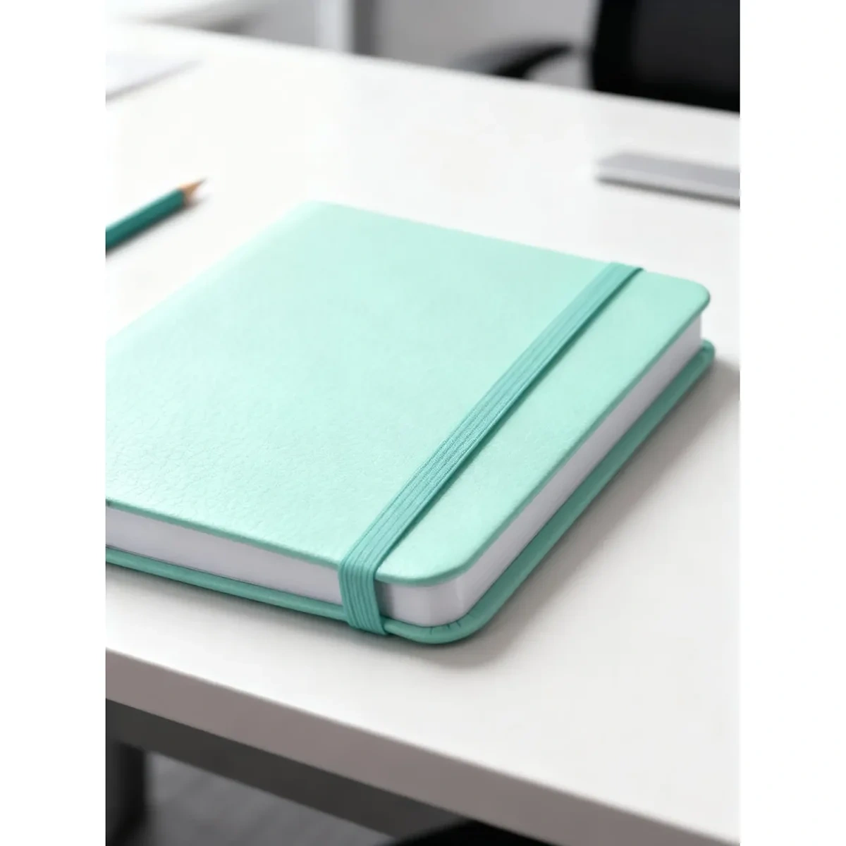 Ежедневник формата A5 предназначен для организации деловых и личных записей. Изделие выполнено в вертикальной ориентации и имеет размер 140×200 мм. Твёрдая обложка из искусственной кожи мятного цвета оформлена в однотонном стиле и дополнена золотистой надписью, нанесённой методом тиснения фольгой. Для удобства использования предусмотрена эластичная резинка-держатель.