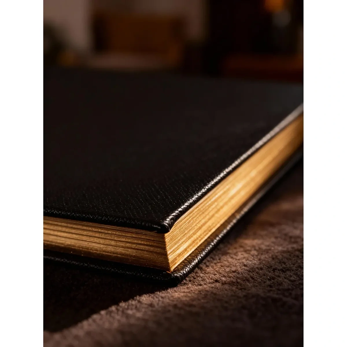 Ежедневник формата A5 предназначен для повседневного планирования и ведения записей. Изделие выполнено в вертикальной ориентации и имеет размер 140×200 мм. Твёрдая обложка из искусственной кожи чёрного цвета оформлена в лаконичном стиле и дополнена тиснением фольгой, что придаёт ему строгий и аккуратный внешний вид.