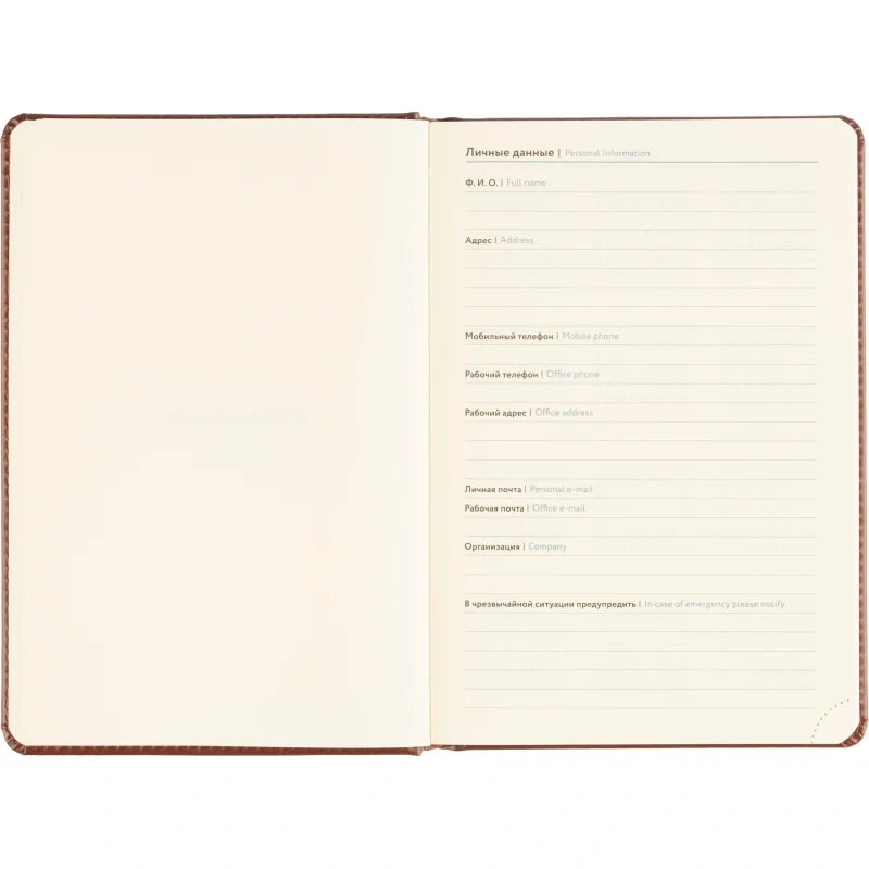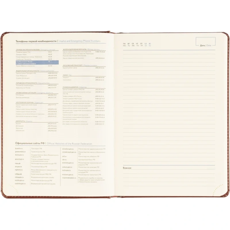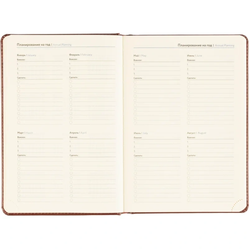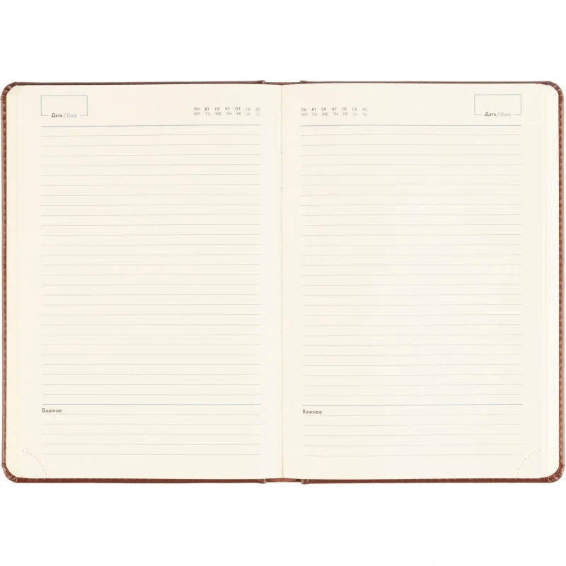 Ежедневник формата А5 предназначен для ведения записей, планирования и организации дел. Внутренний блок включает 160 листов из тонированной офсетной бумаги плотностью 80 г/кв.м с линовкой в линейку. Печать выполнена в две краски.