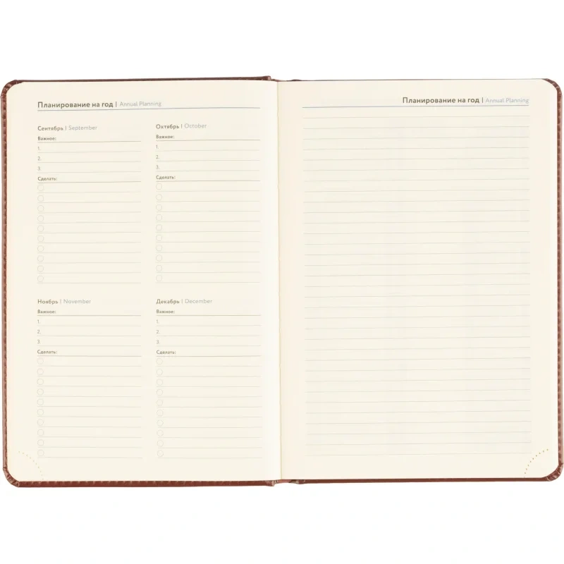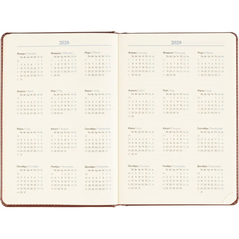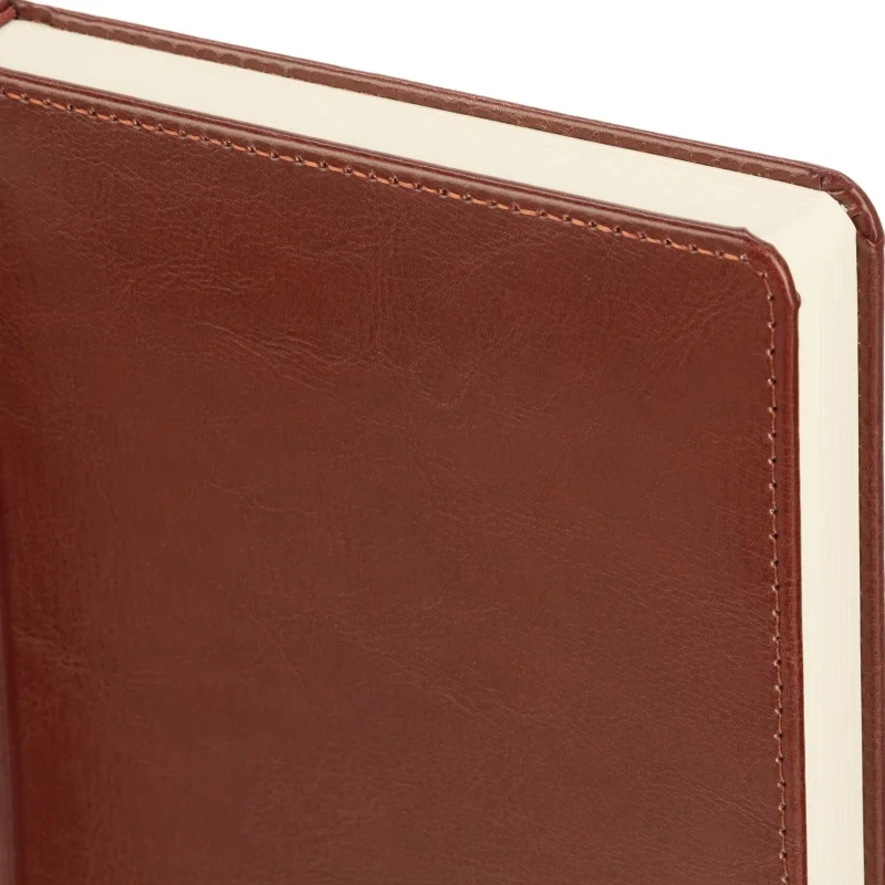 Обложка из искусственной кожи коричневого цвета дополнена тиснением и аккуратной прострочкой по периметру. Твёрдый переплёт на сшивке обеспечивает надёжность при активном использовании. Скруглённые углы, вырубка и перфорация уголков упрощают работу с ежедневником. Встроенное ляссе помогает быстро находить нужную страницу, а календарь на два года делает планирование удобным.