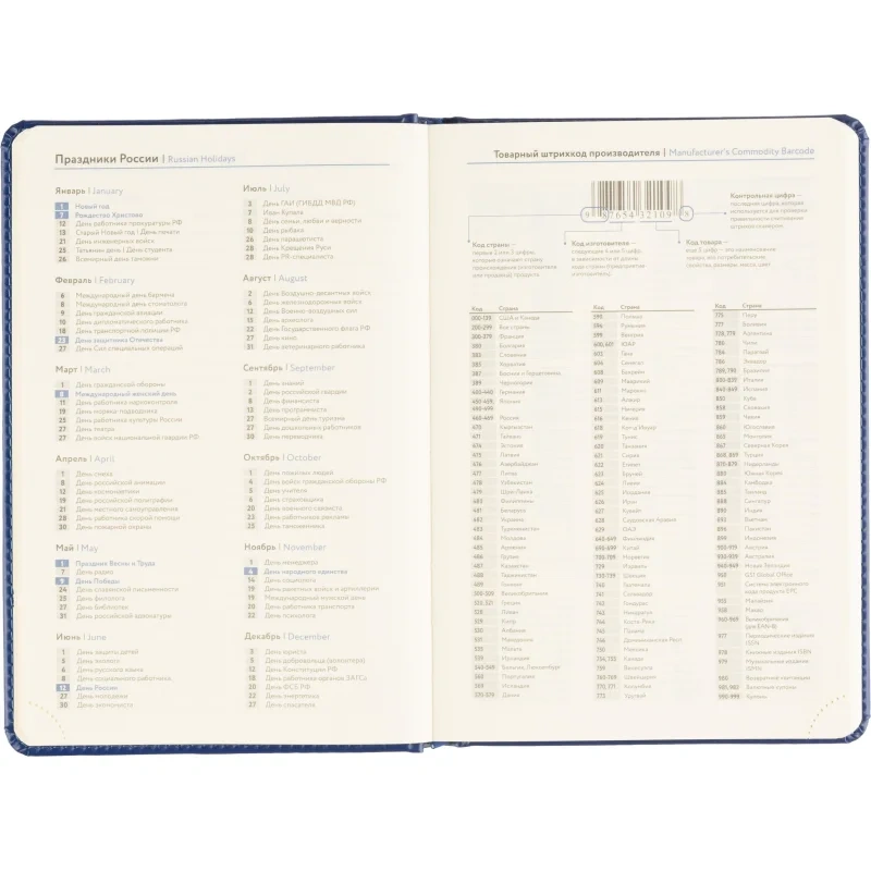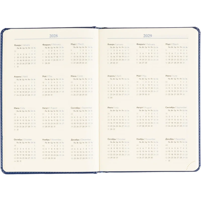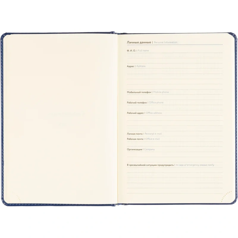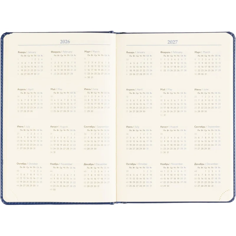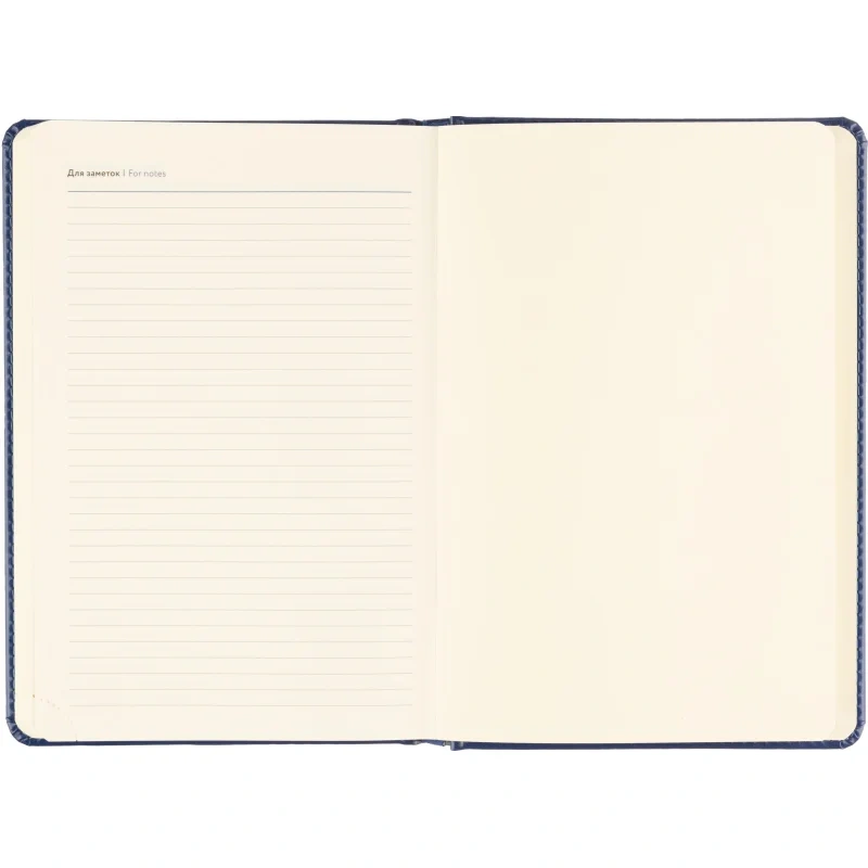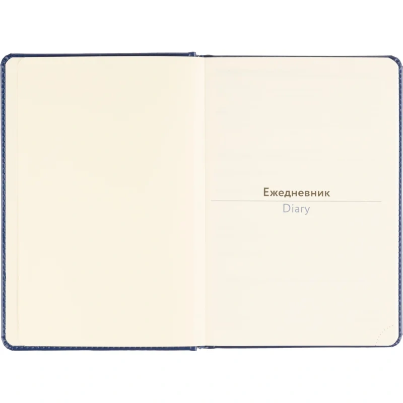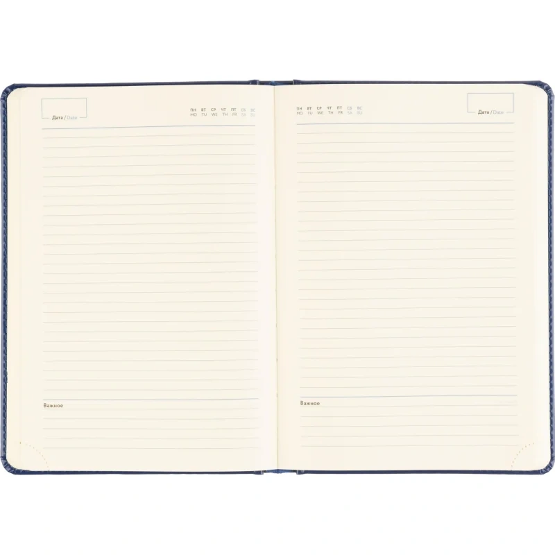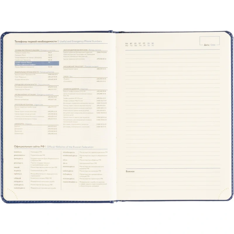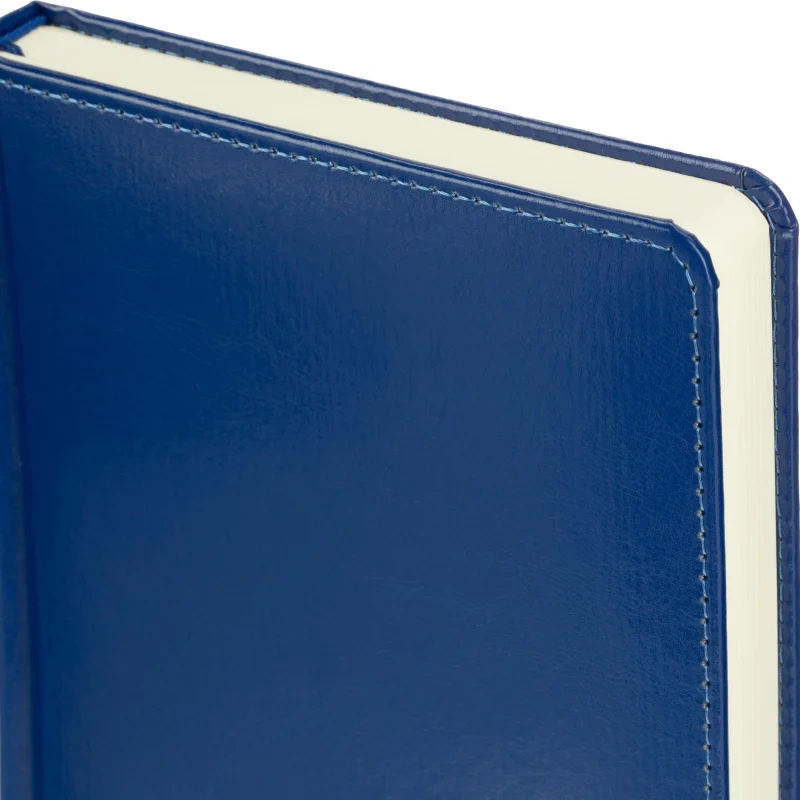 Твёрдая обложка из синей искусственной кожи оформлена тиснением и прострочена по периметру. Переплёт выполнен на сшивке, что гарантирует прочность при длительном использовании. Скруглённые углы листов, вырубка блока и наличие перфорации уголков делают использование особенно комфортным. Ежедневник оснащён ляссе и включает календарь на два года. Изделие может быть персонализировано под заказ.