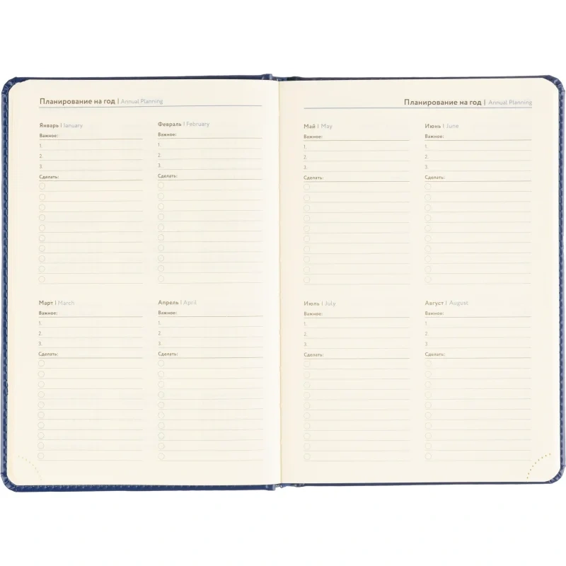 Ежедневник формата А5 подойдёт для планирования дел, заметок и рабочих записей. Он содержит 160 листов из офсетной бумаги плотностью 80 г/кв.м с линовкой в линейку. Бумага тонированная, с печатью в две краски, что делает текст более читаемым и удобным для восприятия.
