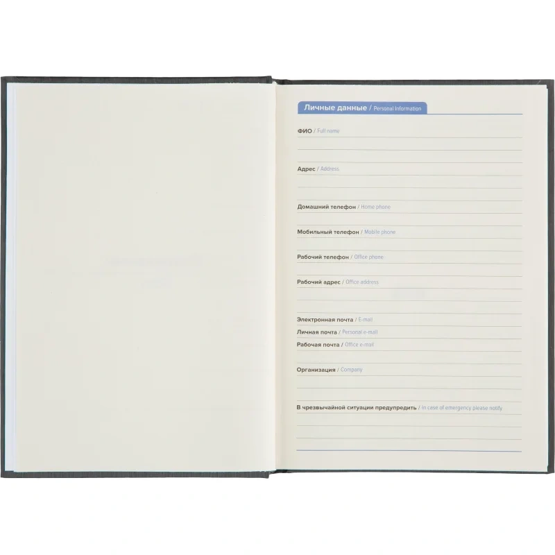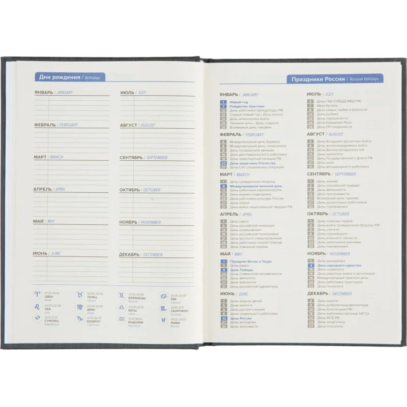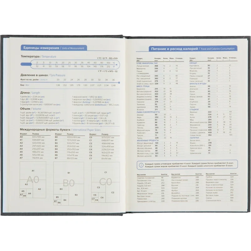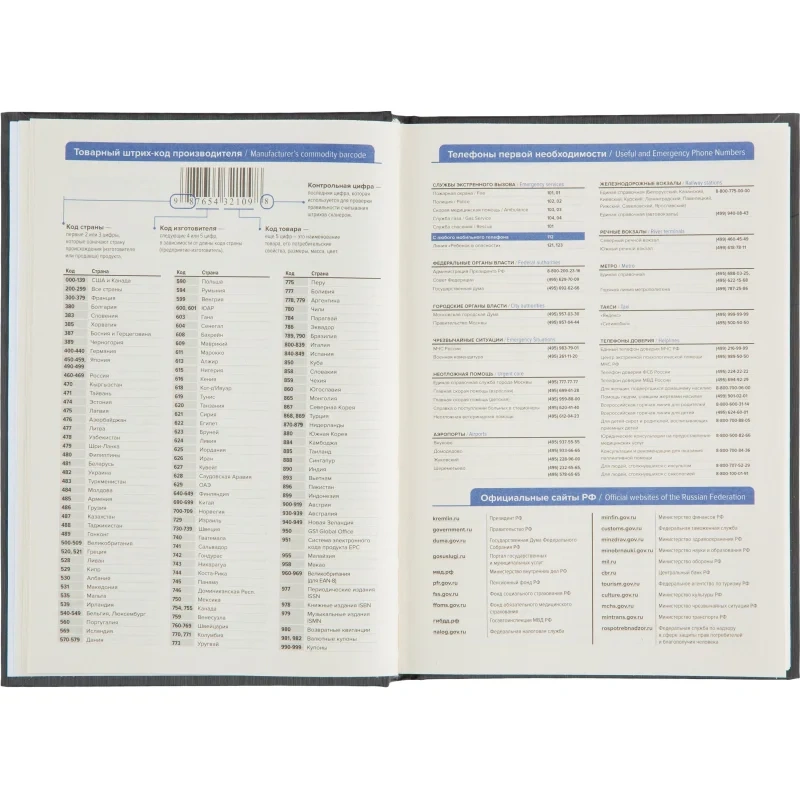 Внутренний блок содержит 352 страницы тонированной офсетной бумаги плотностью 55 г/кв.м, разлинованной в линейку и прошитой для долговечности. В ежедневнике предусмотрен информационно-справочный раздел с перечнем праздников России, международными кодами городов России, цифровыми кодами ГИБДД, справочником неметрических единиц с переводом в метрические, а также таблицей размеров одежды. Календарь рассчитан на 2024–2027 годы. Изделие поставляется в термоусадочной плёнке.