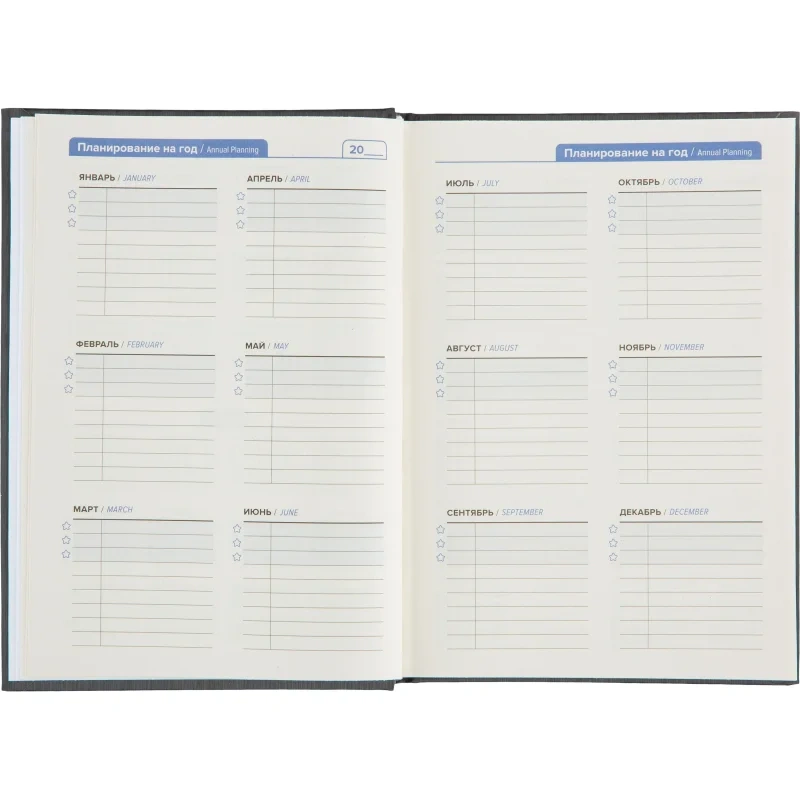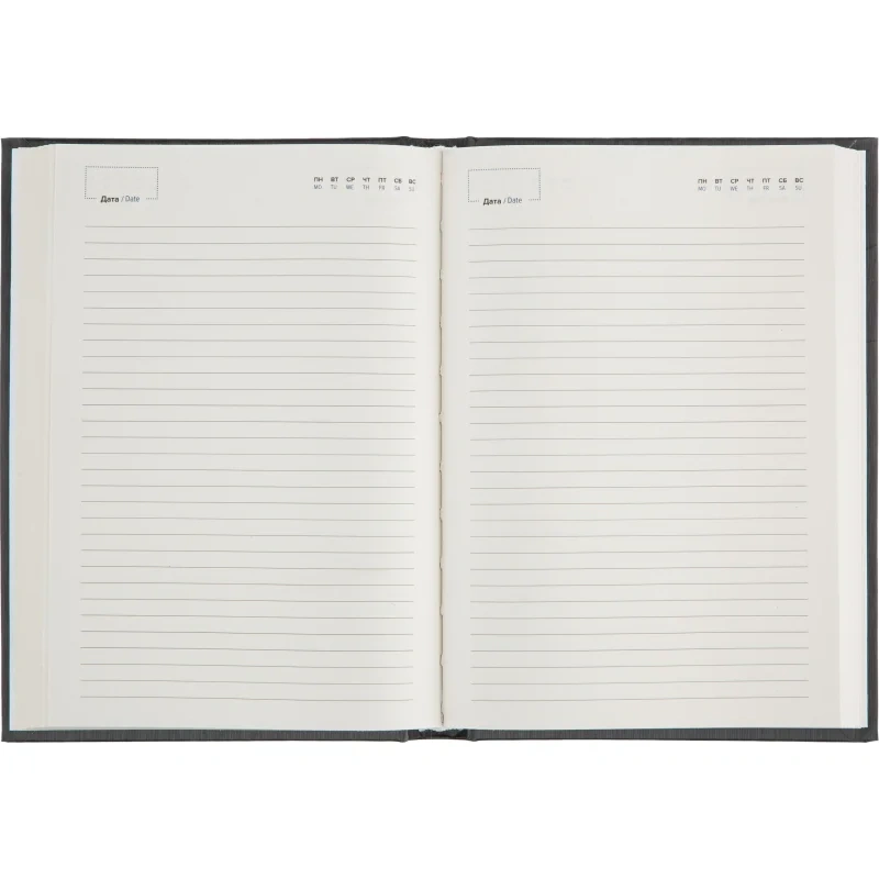 Ежедневник (143×205 мм) подходит для планирования задач и ведения ежедневных записей. Обложка выполнена из искусственной кожи чёрного цвета, отличается строгим и универсальным внешним видом. Твёрдая основа надёжно защищает внутренний блок.