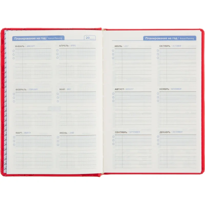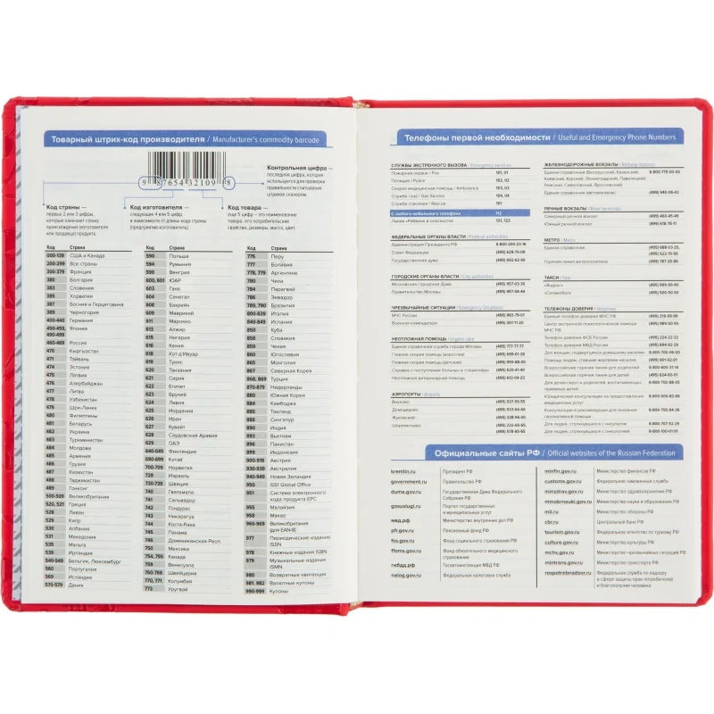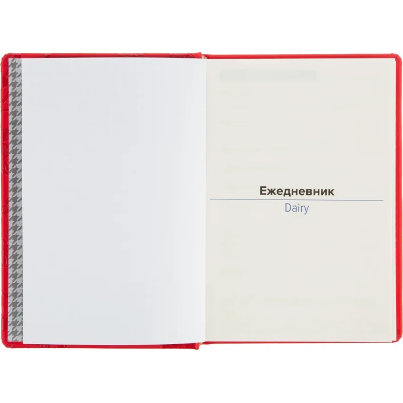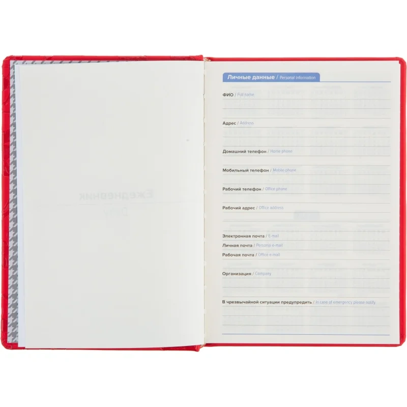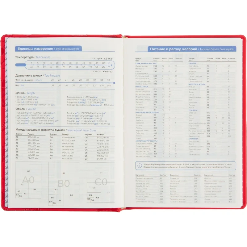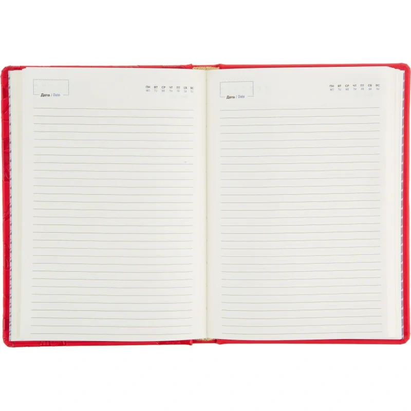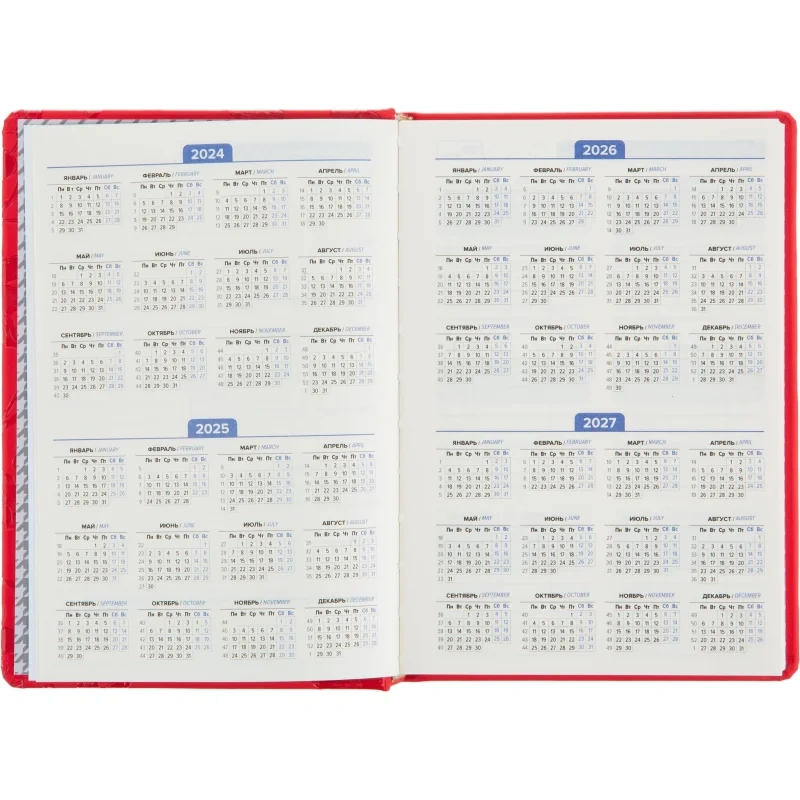 Внутренний блок включает 160 листов тонированной офсетной бумаги плотностью 80 г/кв.м, разлинованной в линейку и прошитой для долговечности. В структуре еженедельника предусмотрен информационно-справочный раздел: праздники России, международные коды городов, цифровые коды ГИБДД, справочник неметрических единиц и перевод в метрические, размеры одежды. Для сортировки информации добавлен алфавитный блок без вырубки. На заднем форзаце размещён бумажный конверт для хранения мелких документов. Встроен календарь на 2024–2027 годы. Поставляется в термоусадочной плёнке.