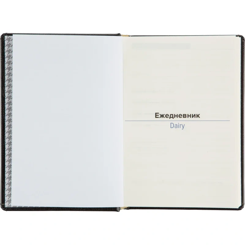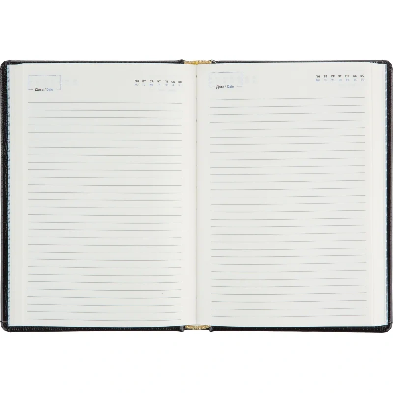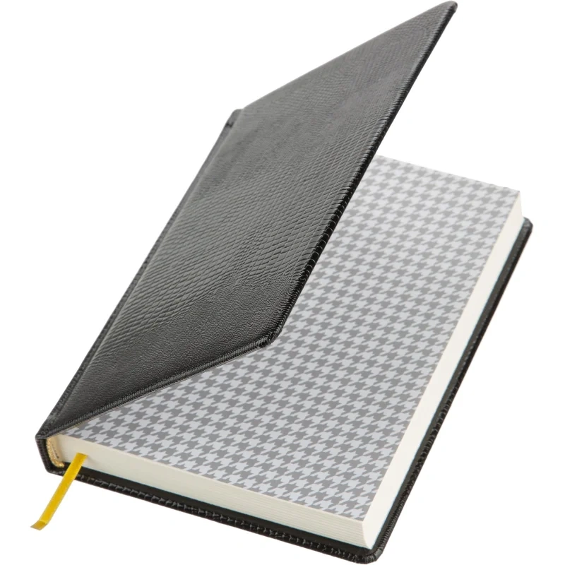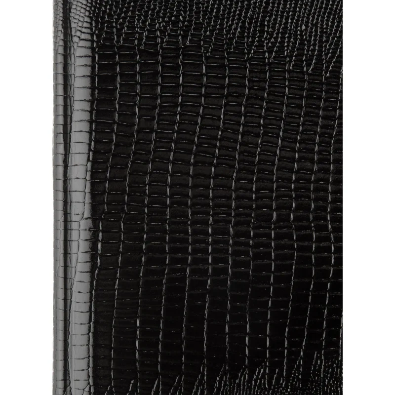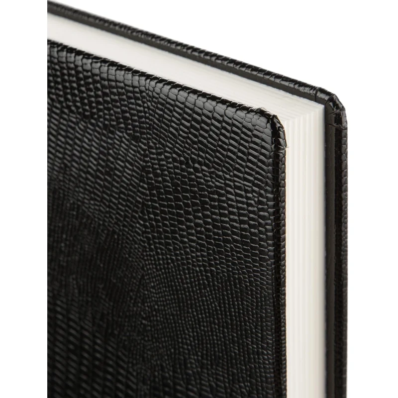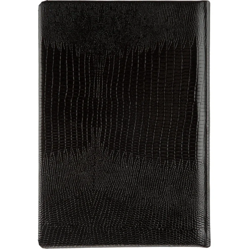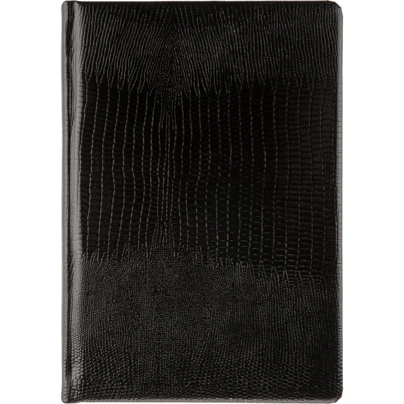 Ежедневник (143×205 мм) предназначен для ведения записей и планирования на каждый день. Обложка выполнена из натуральной лаковой кожи с фактурой под кожу ящерицы. Лаковое покрытие придаёт глубину и яркость чёрному цвету, подчёркивая качество и оригинальность изделия. Обложка дополнена поролоновым слоем для комфортного использования.