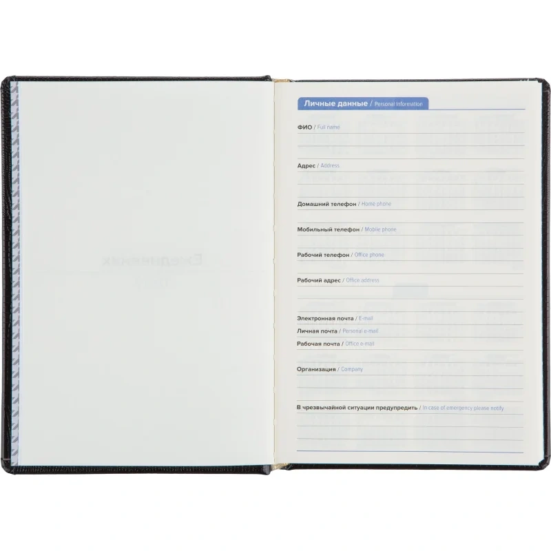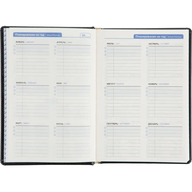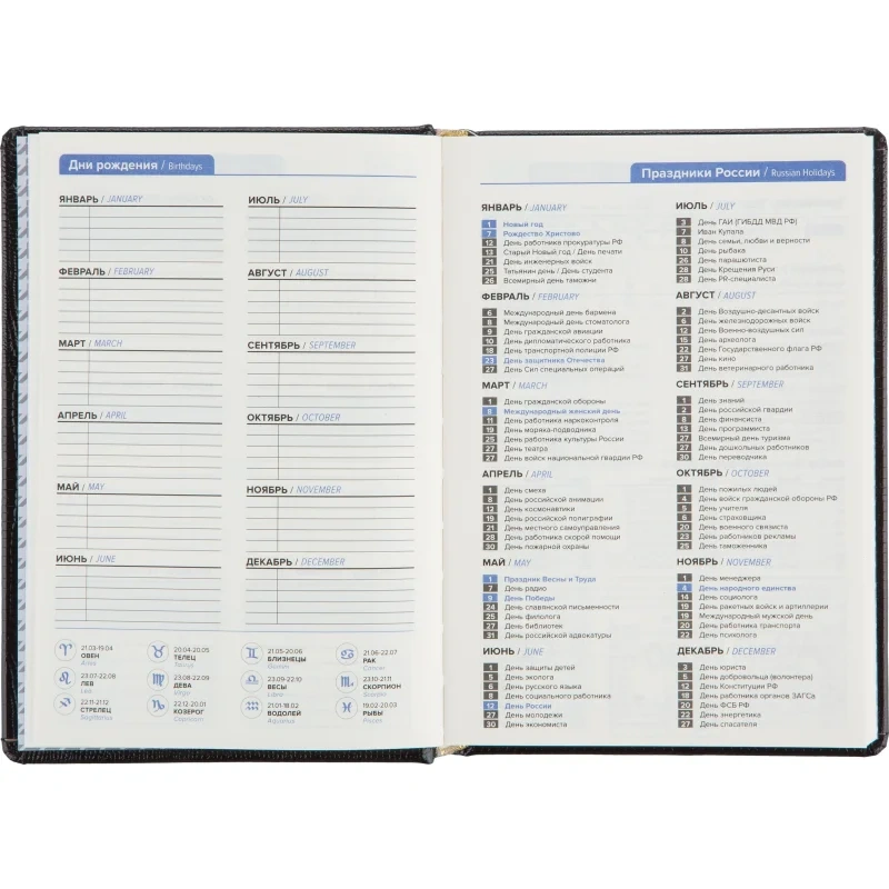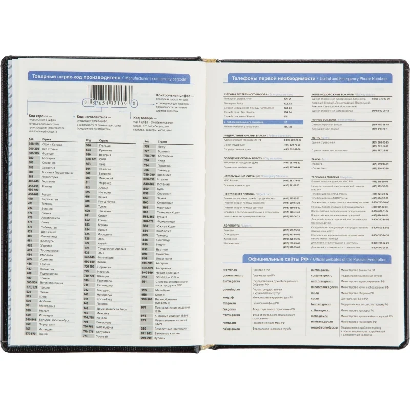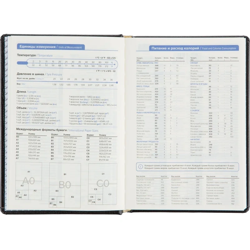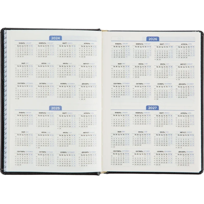 Внутренний блок содержит 160 листов тонированной офсетной бумаги плотностью 80 г/кв.м, разлинованной в линейку и прошитой для долговечности. В ежедневнике предусмотрен информационно-справочный раздел: праздники России, международные коды городов, цифровые коды ГИБДД, справочник неметрических единиц и перевод в метрические, размеры одежды. Для удобства поиска информации добавлен алфавитный блок без вырубки. Встроен календарь на 2024–2027 годы. Поставляется в термоусадочной плёнке.