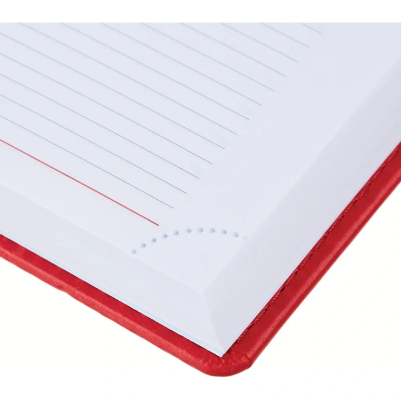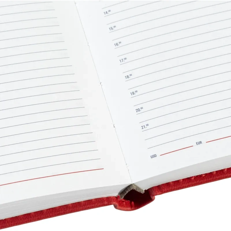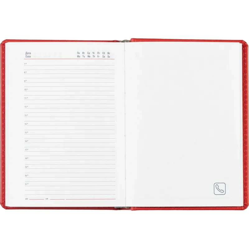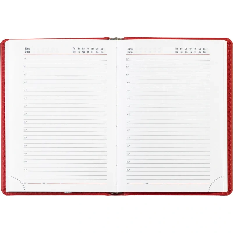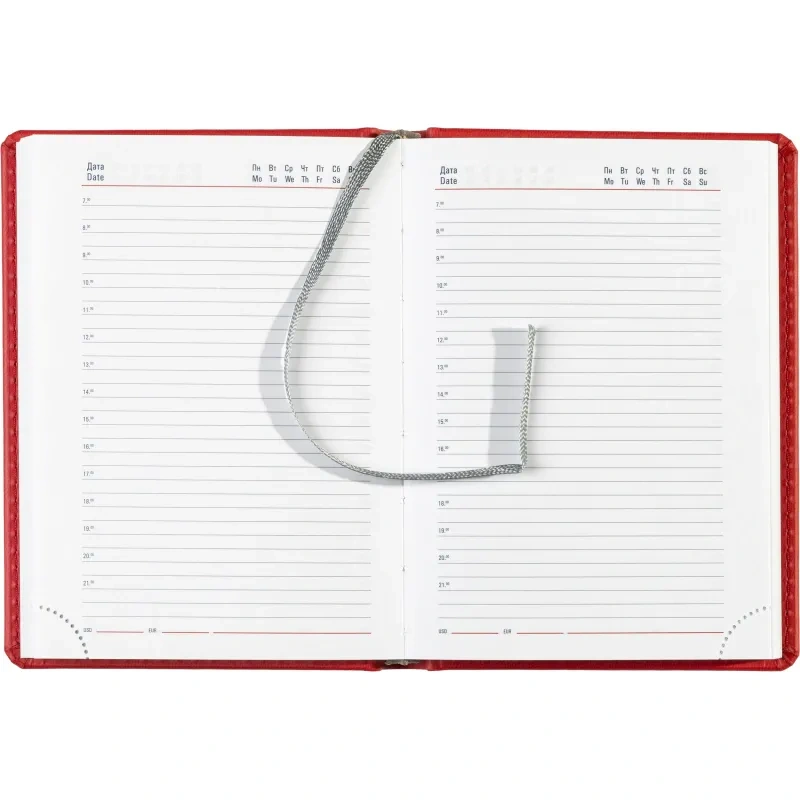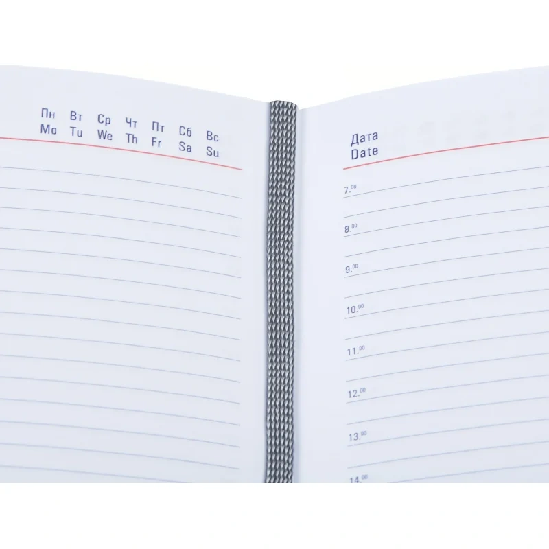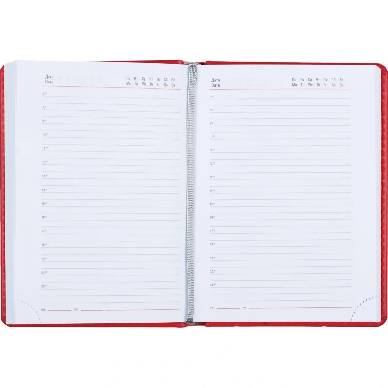 Внутренний блок состоит из 176 листов белой офсетной бумаги плотностью 90 г/кв.м. Бумага плотная, удобна в работе и приятна на ощупь. Листы с линейкой напечатаны в две краски. Ежедневник оснащён перфорацией уголков и закладкой-ляссе. На каждую страницу приходится один день недели.