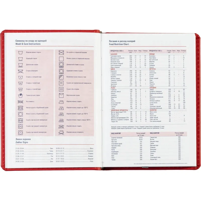 Дополнительный справочный блок содержит телефоны первой необходимости, международные коды городов России и мира, расстояния между городами Европы и СНГ, размеры одежды, штриховой код, знаки зодиака, доменные зоны мира, карту поясного времени, информацию о питании и расходе калорий, неметрические единицы и форматы бумаги.