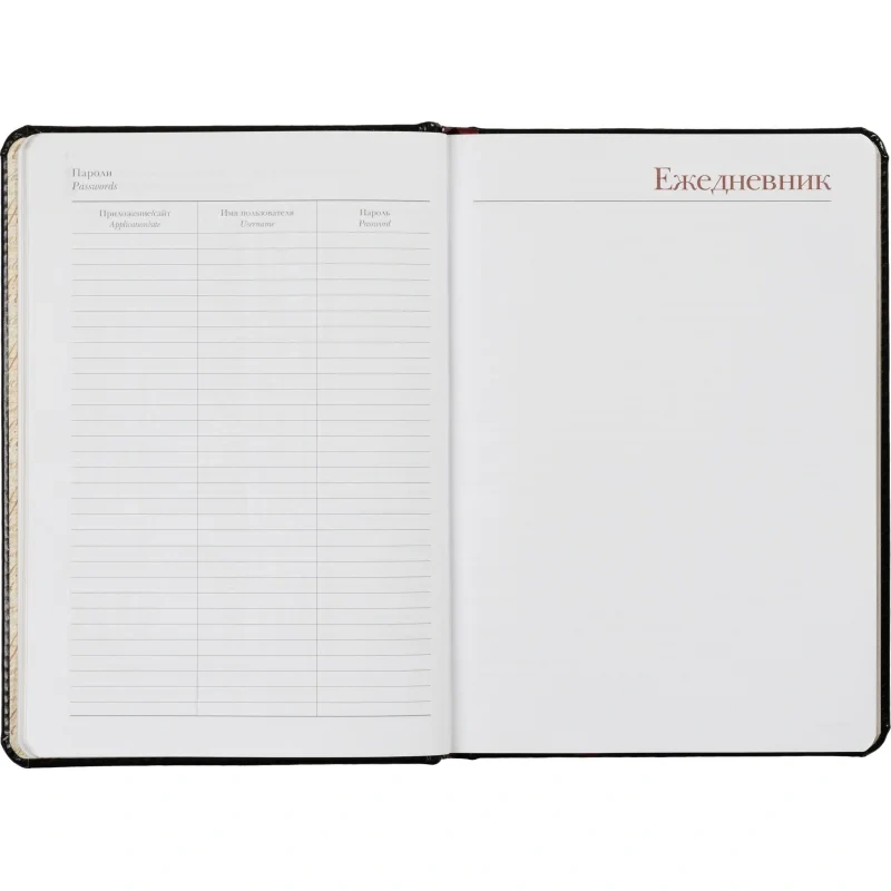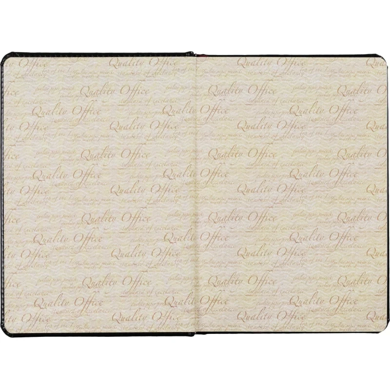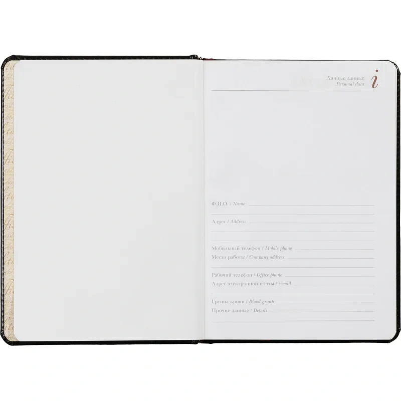 Внутренний блок состоит из 136 листов (272 страницы) белой офсетной бумаги плотностью 90 г/кв.м., с размером 140×200 мм. Срез блока имеет позолоту, добавляя изделию эстетическую ценность. Печать выполнена в два цвета, а страницы имеют линейку для удобства записи. Ляссе бордового цвета помогает быстро найти нужную страницу.