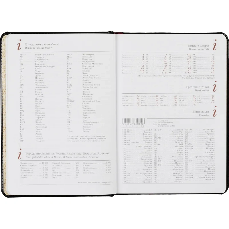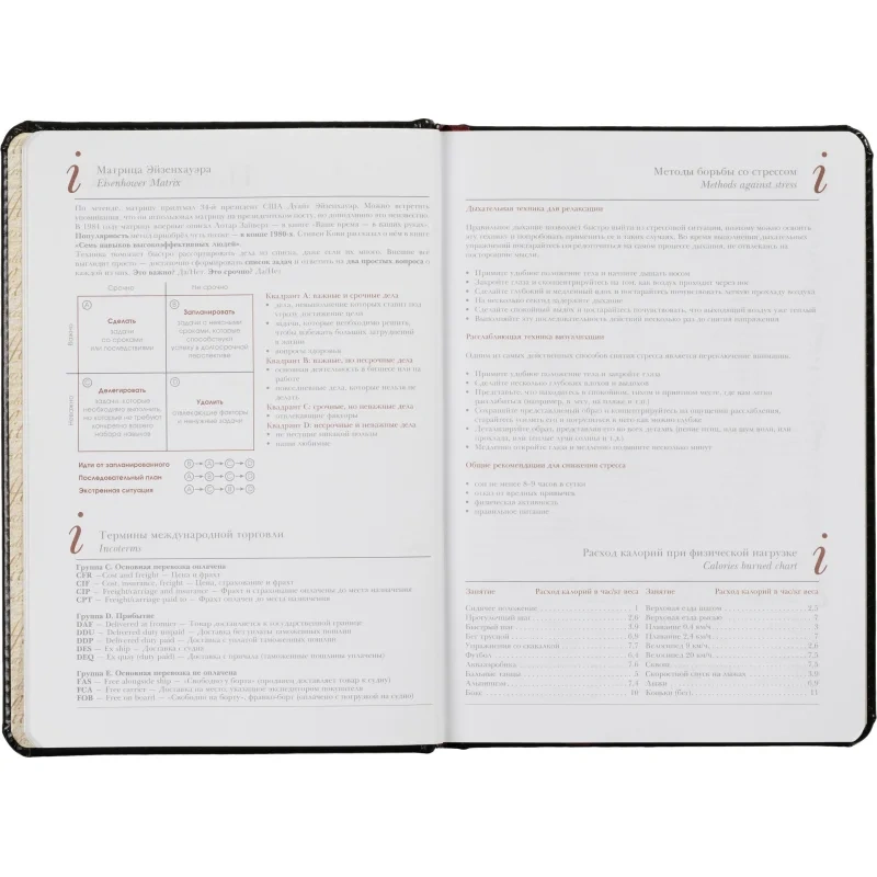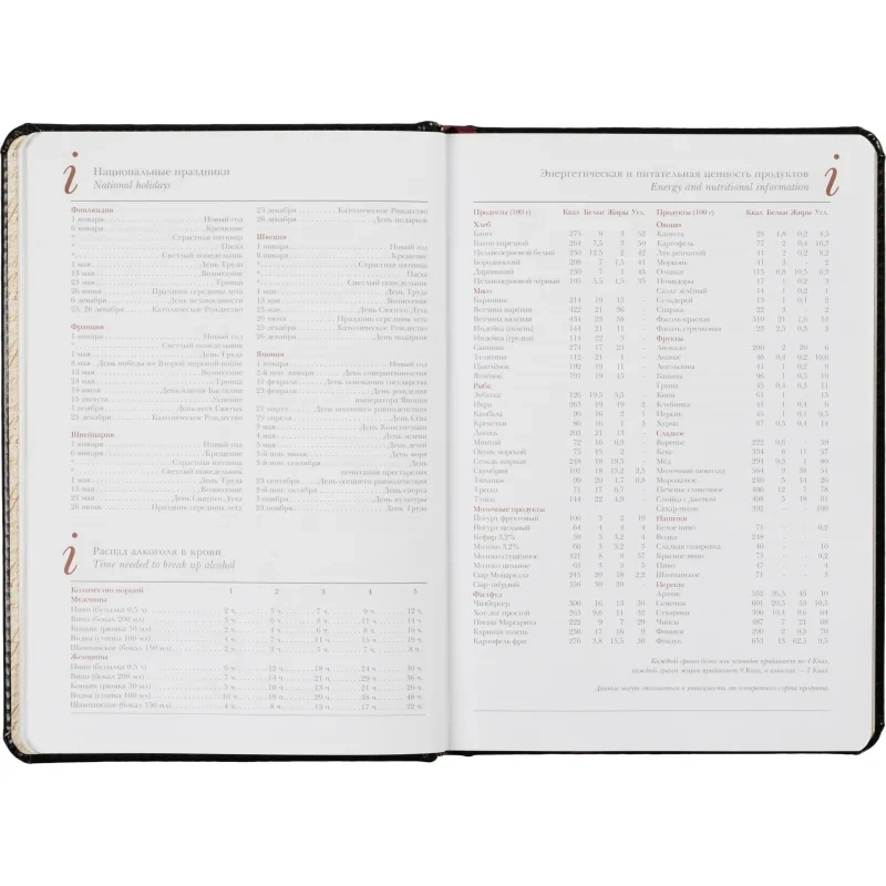 Ежедневник включает дополнительную справочную информацию на 7 листах (14 страниц), которая охватывает полезные данные, такие как часовые пояса, аэропорты Европы, международные телефонные коды, размеры одежды и международные праздники. В конце ежедневника расположена телефонная книга на 19 страницах.