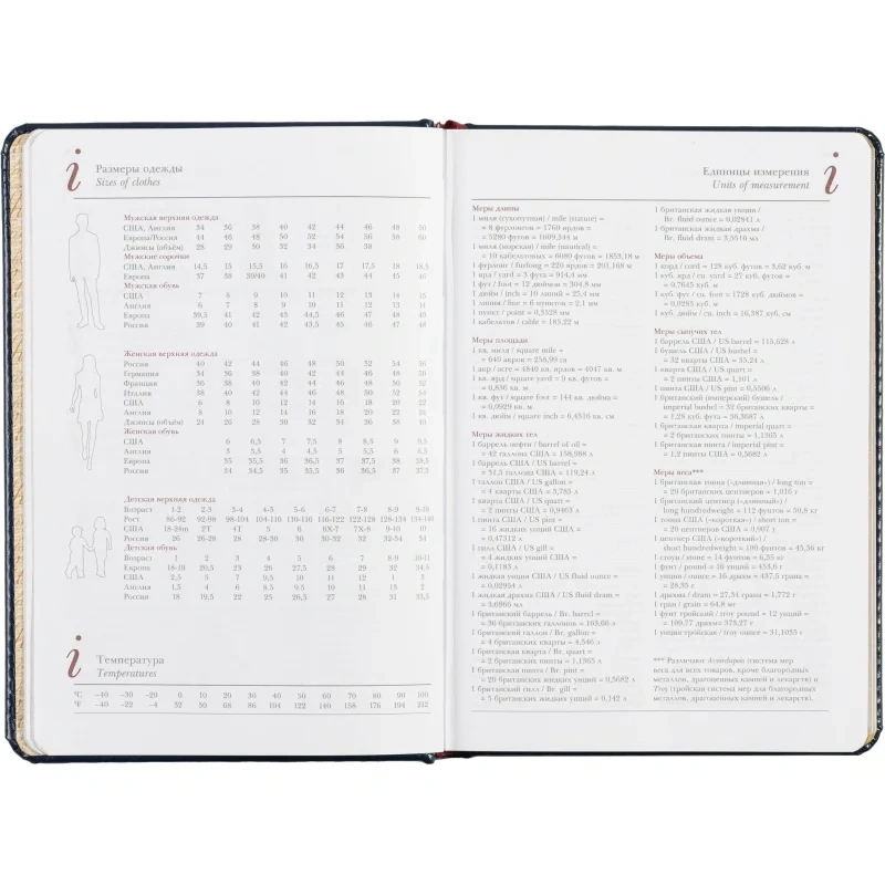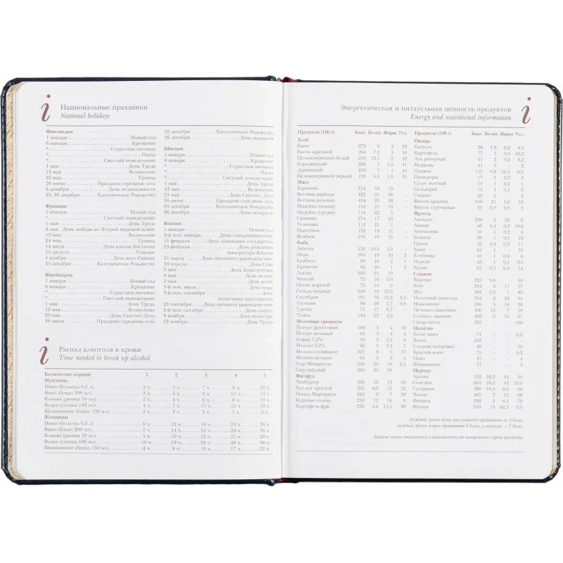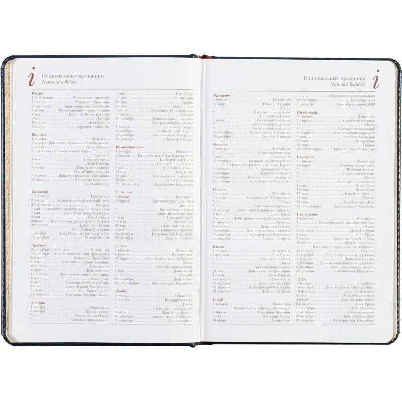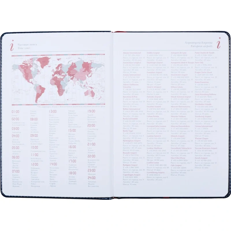 Кроме того, в ежедневнике предусмотрена справочная информация на 7 листах (14 страниц), включающая данные о часовых поясах, аэропортах Европы, штрих-кодах, международных праздниках, а также полезную информацию по единицам измерения и кодам стран и городов.