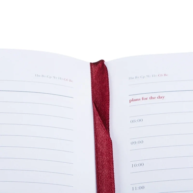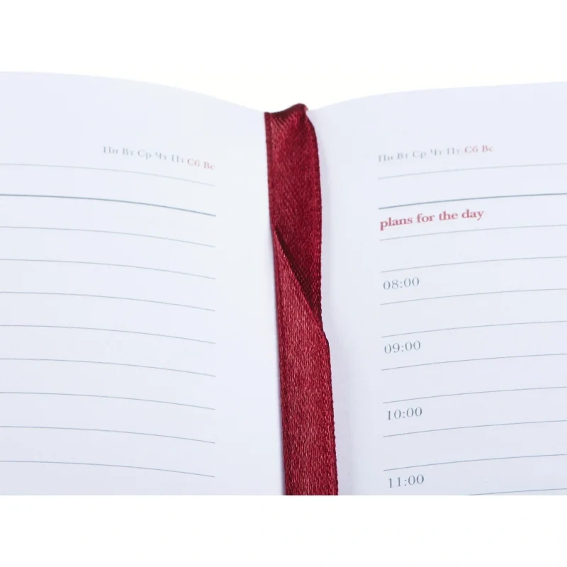 Внутренний блок состоит из 136 листов белой офсетной бумаги плотностью 90 г/кв.м. Листы разлинованы в линейку. Ежедневник дополнен золотистым обрезом и бордовым ляссе, что придаёт изделию дополнительный шарм. Размер блокнота — A5 (145×205 мм), он имеет удобную вертикальную ориентацию и скруглённые углы. Печать блока выполнена в два цвета, что придаёт дополнительную эстетику.