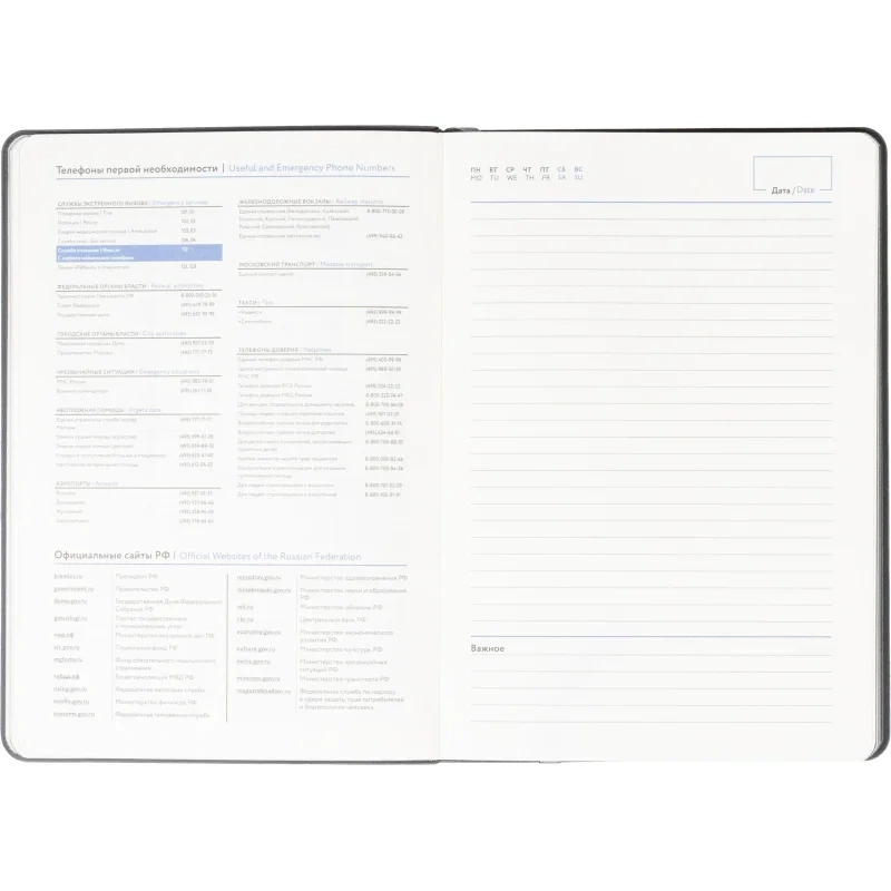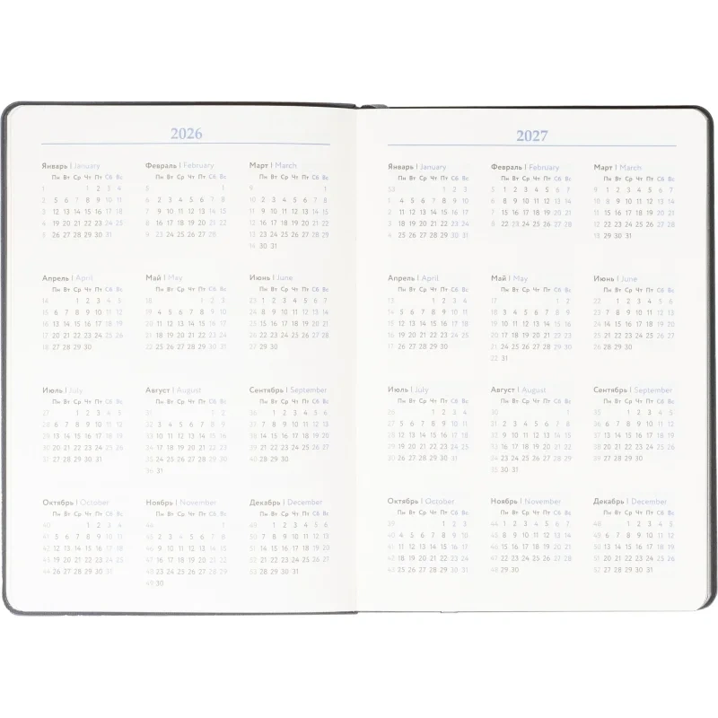 Размер ежедневника — 14.2×20.5 см. Внутри предусмотрен календарь на два года. Ежедневник подходит под персонализацию.