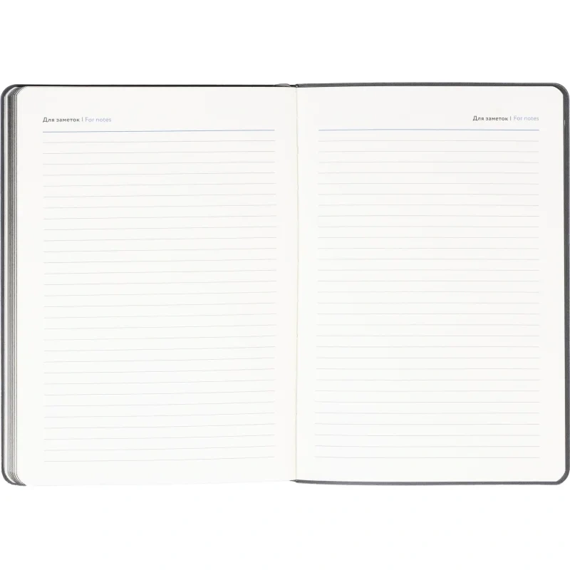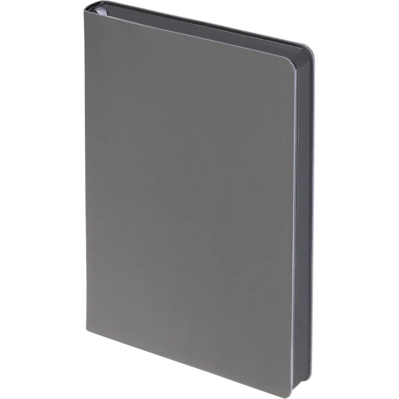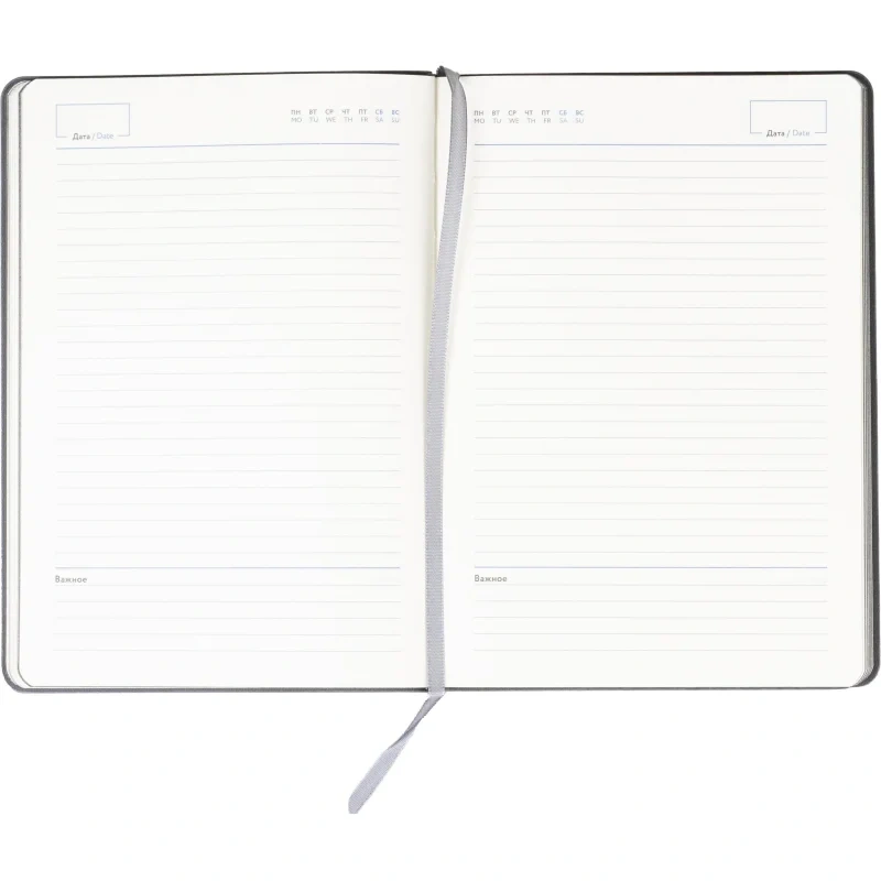 Ежедневник формата A5 подходит для записи планов и заметок без указания дат. Обложка выполнена из искусственной кожи серого цвета с тиснением и оформлена в однотонном стиле. Мягкий переплёт делает изделие лёгким и удобным для ежедневного использования. Крепление блока выполнено сшивкой, что обеспечивает его надёжность.