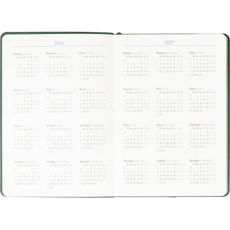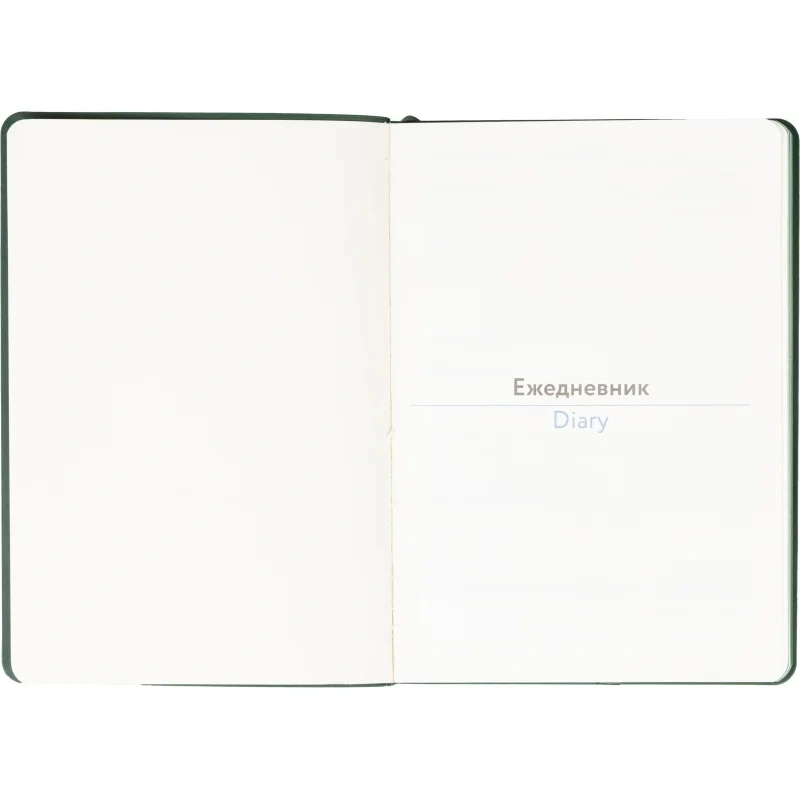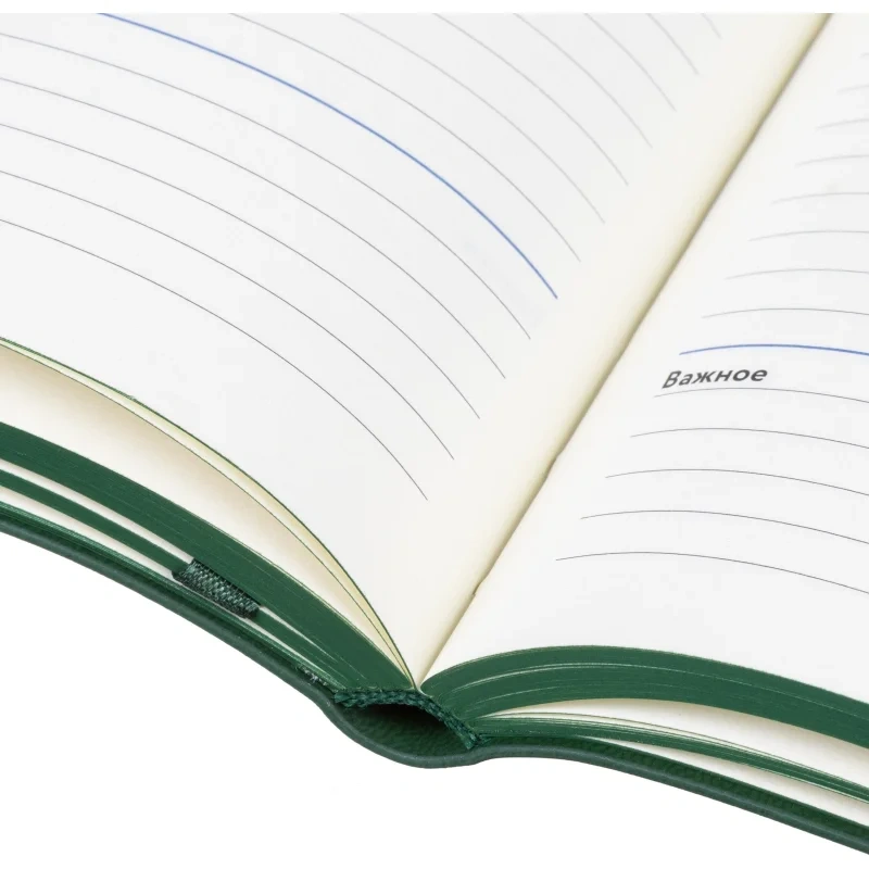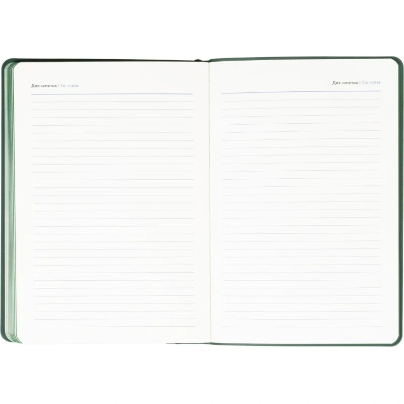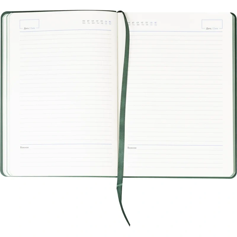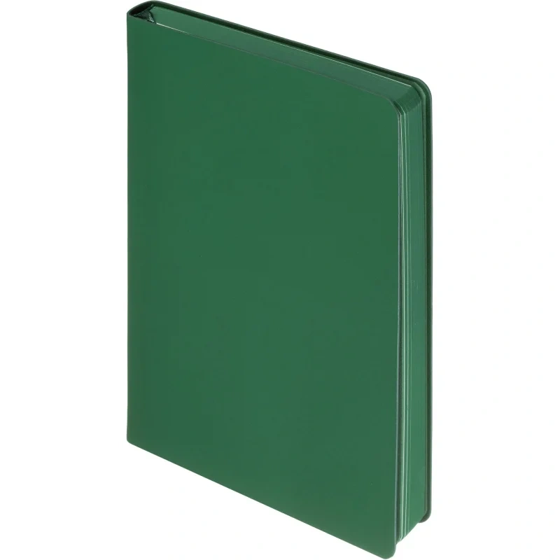 Ежедневник формата A5 подходит для ведения записей и планирования без указания дат. Обложка выполнена из искусственной кожи тёмно-зелёного цвета с тиснением и оформлена в однотонном стиле. Мягкий переплёт делает изделие удобным для повседневного использования, а сшивка блока обеспечивает его надёжность.