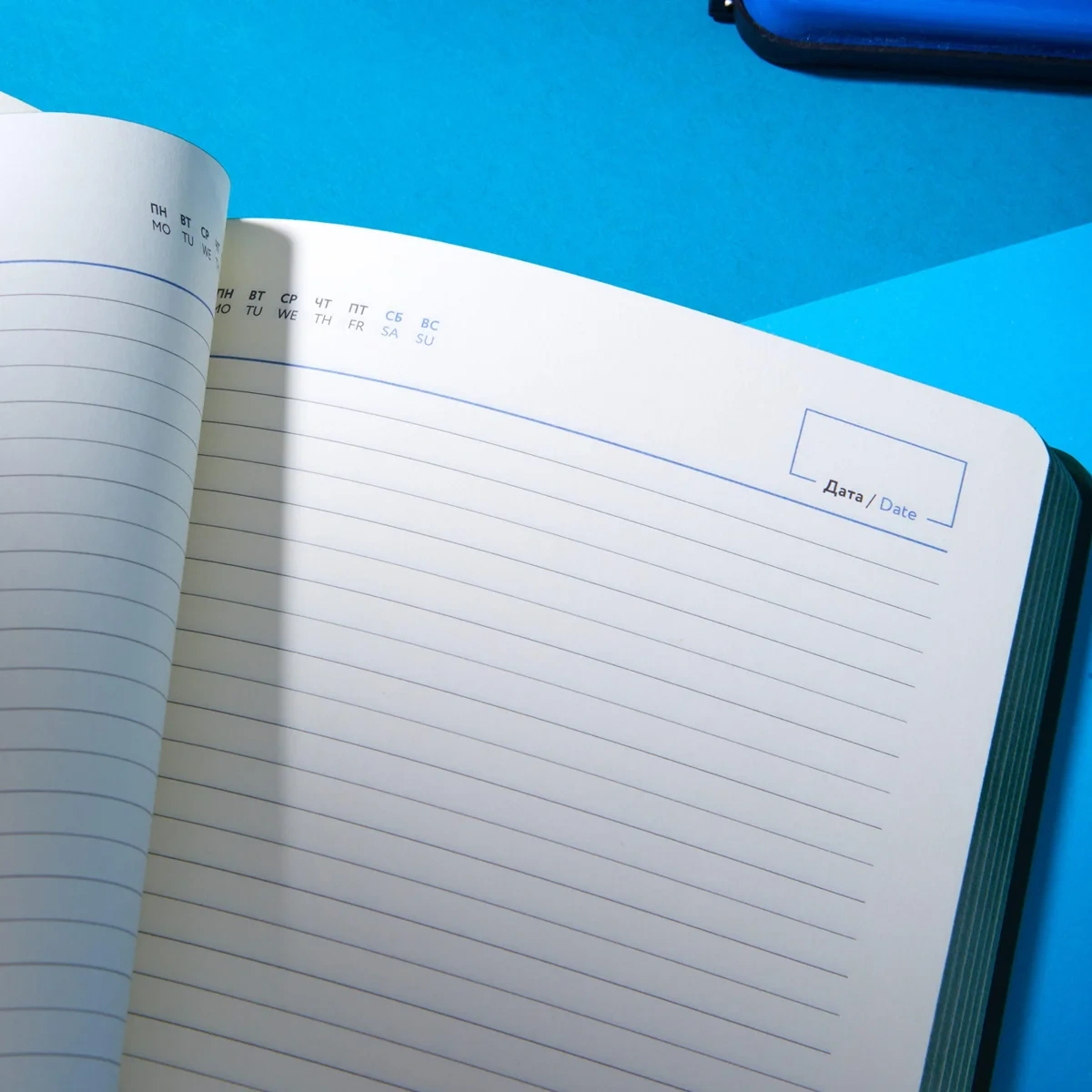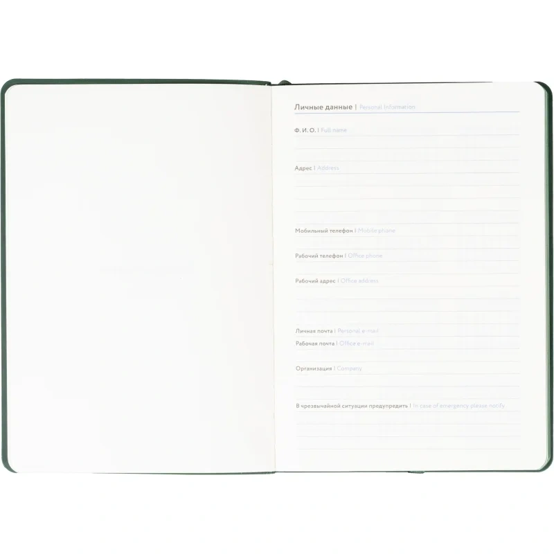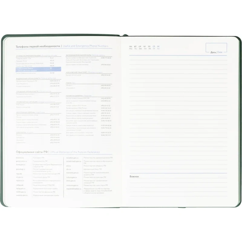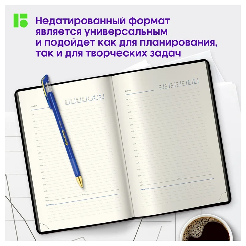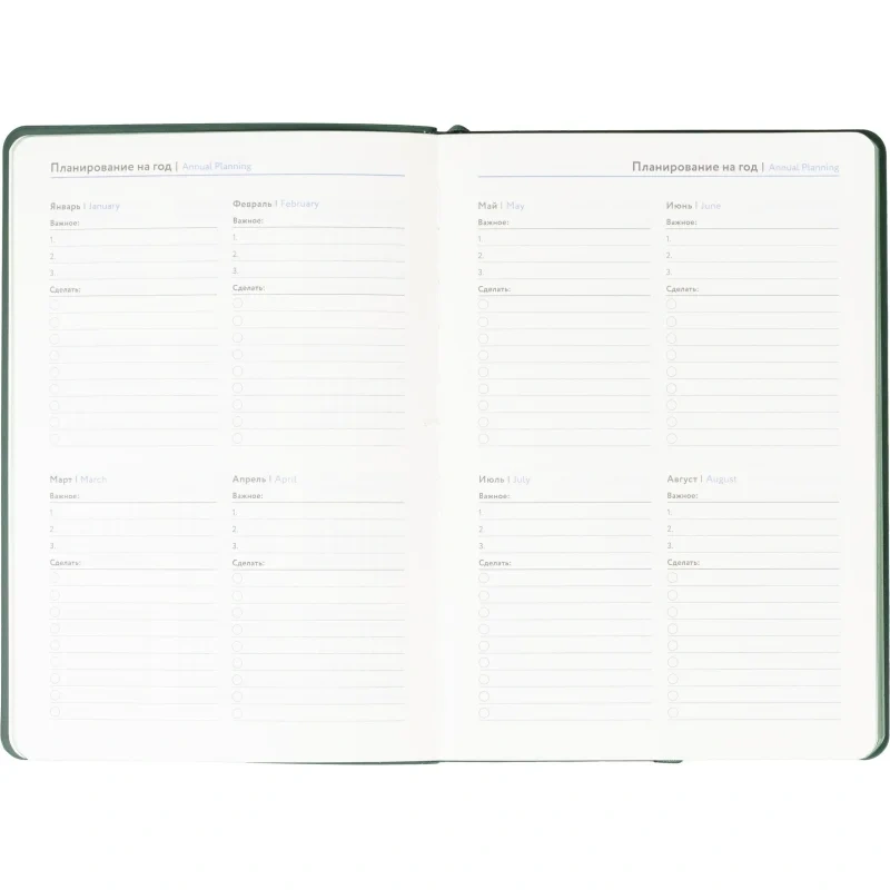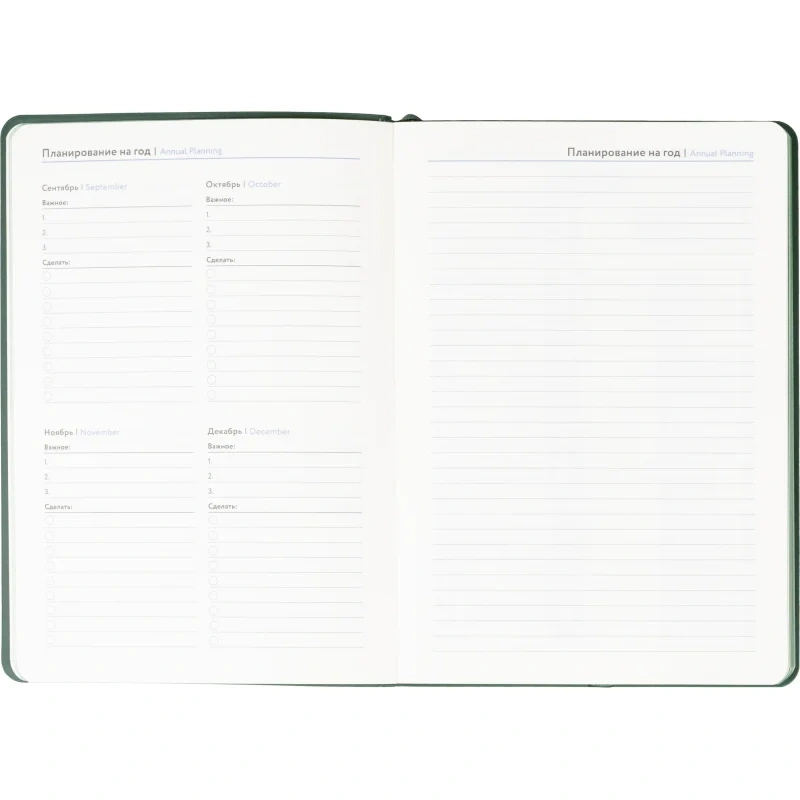 Ежедневник формата A5 подходит для ведения записей и планирования без указания дат. Обложка выполнена из искусственной кожи тёмно-зелёного цвета с тиснением и оформлена в однотонном стиле. Мягкий переплёт делает изделие удобным для повседневного использования, а сшивка блока обеспечивает его надёжность.