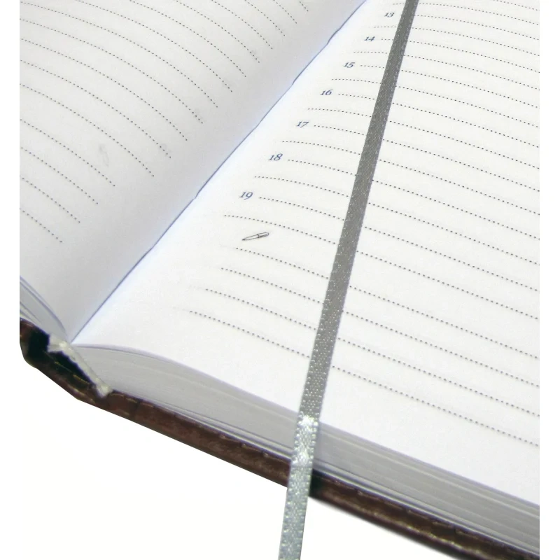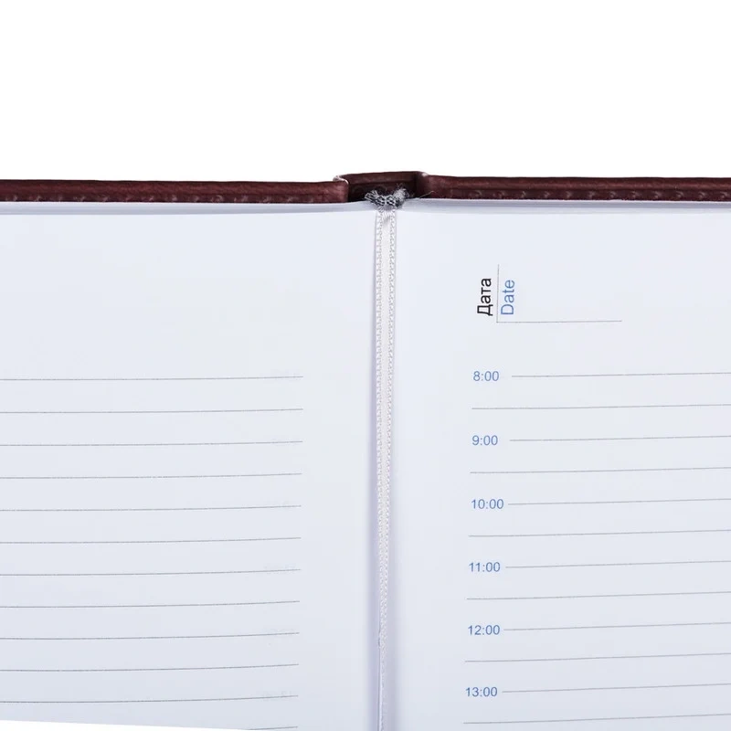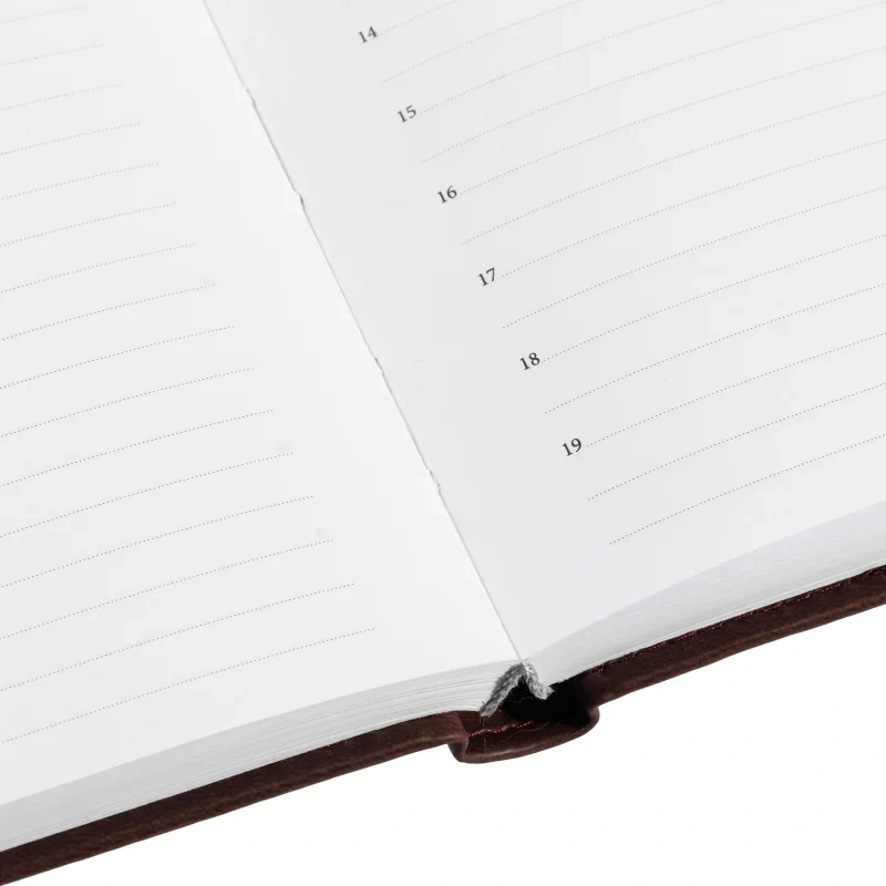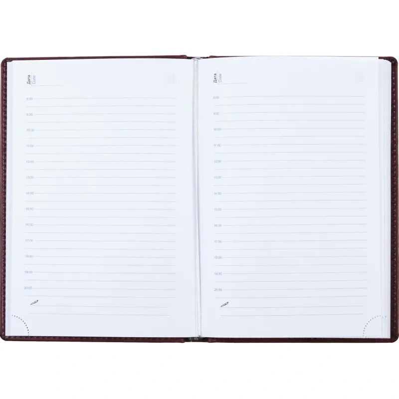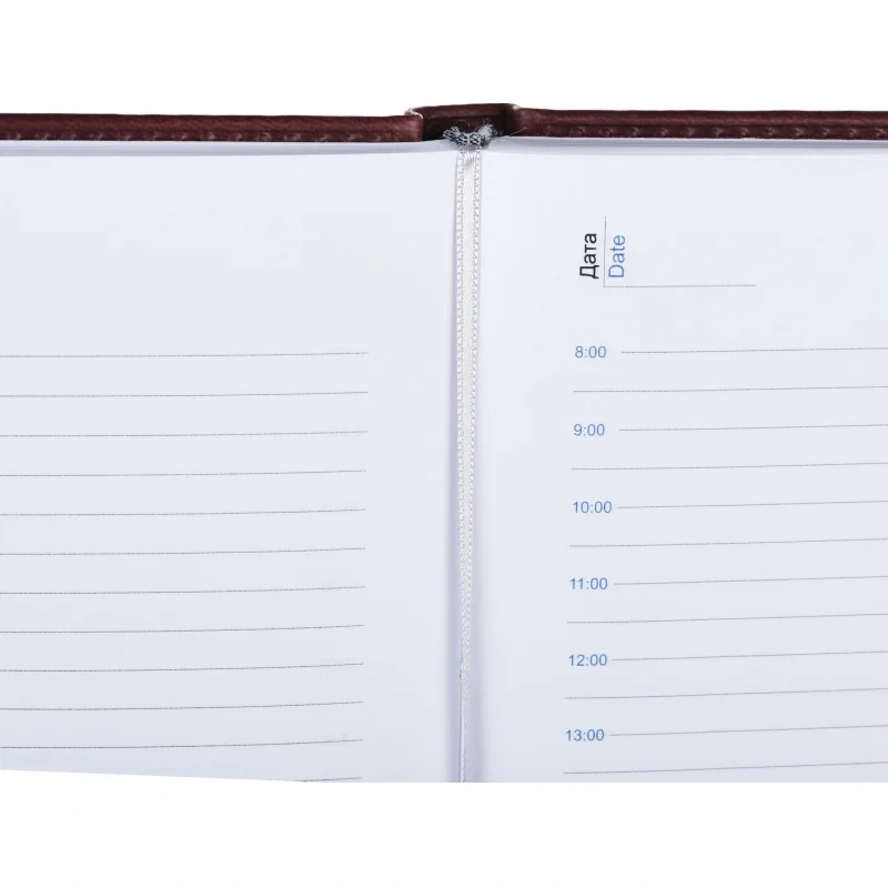 Внутренний блок состоит из 176 листов белой офсетной бумаги плотностью 90 г/кв.м. Листы в линейку напечатаны в две краски. На каждую страницу приходится один день недели. Ежедневник оснащён удобной закладкой-ляссе и перфорацией уголков для удобства использования.