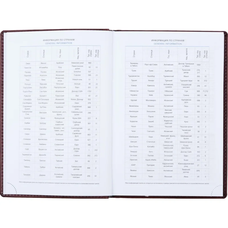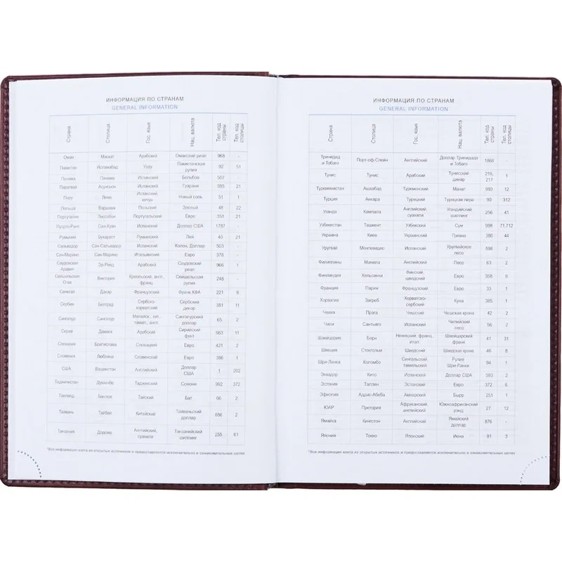 Справочный информационный блок включает личные данные, государственные праздники, междугородные телефонные коды России, Москвы, Санкт-Петербурга и Екатеринбурга, знаки зодиака, штриховой код, сведения по странам, цифровые коды ГИБДД, форматы бумаги, информацию о температуре и планы на год.