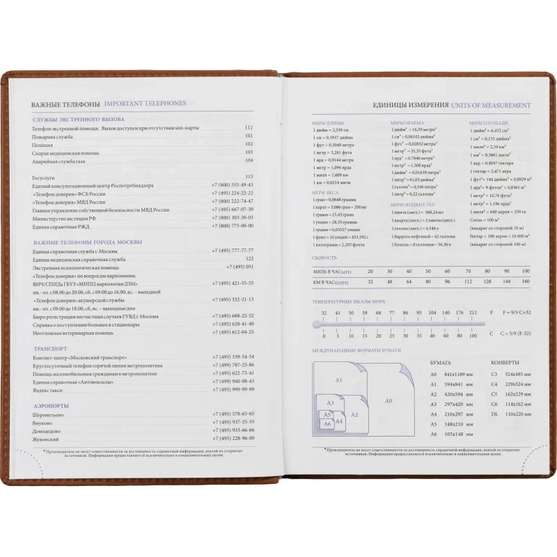 Справочный информационный блок содержит личные данные, праздники, междугородные телефонные коды России, Москвы, Санкт-Петербурга и Екатеринбурга, знаки зодиака, штриховой код, сведения по странам, цифровые годы ГИБДД, форматы бумаги, данные о температуре и планы на год. Карты России и Европы на форзаце отсутствуют.