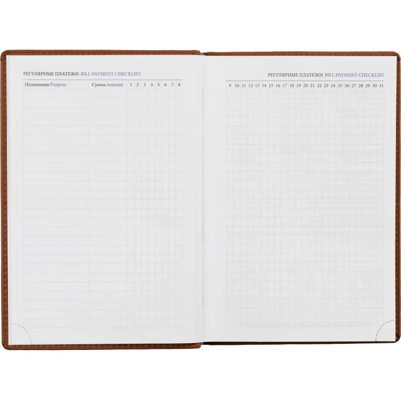 Внутренний блок состоит из 176 листов (352 страницы) белой офсетной бумаги плотностью 90 г/кв.м. Листы с линейкой напечатаны в две краски. Ежедневник оснащён перфорацией уголков и серебристой закладкой-ляссе. В изделии предусмотрена вставка — алфавитный блок без вырубки.