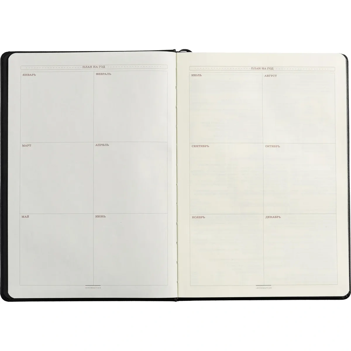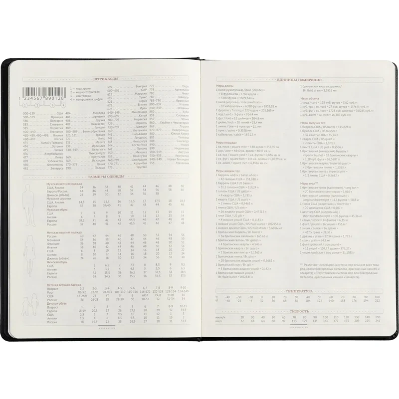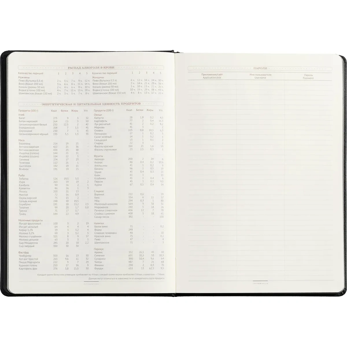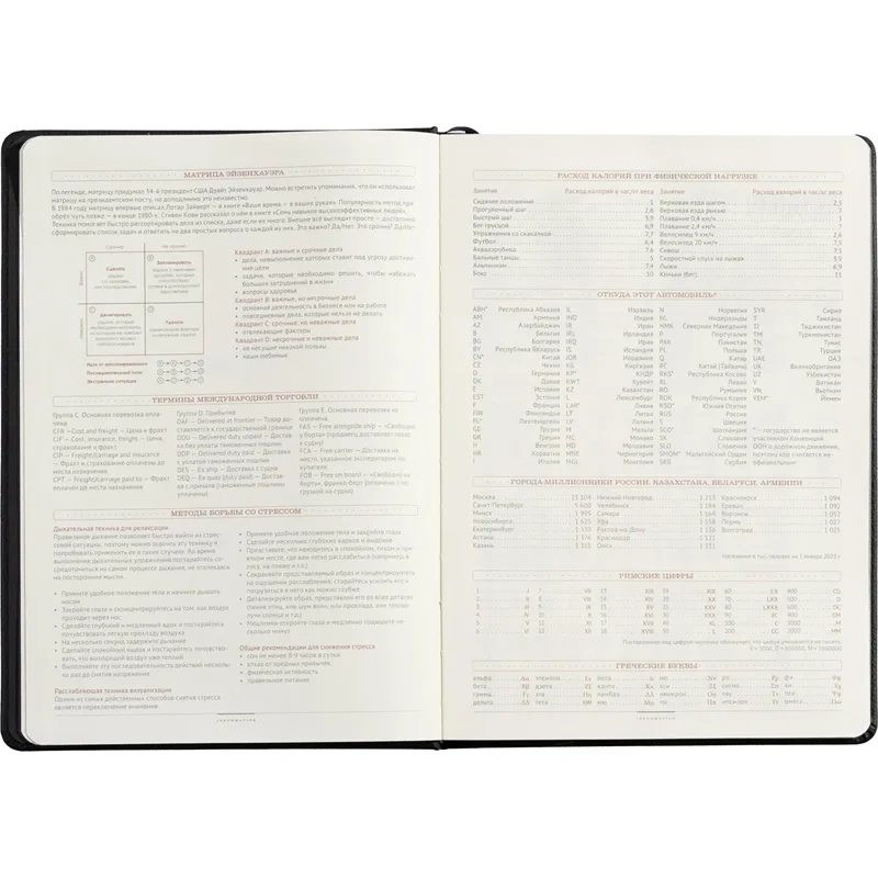 Внутренний блок состоит из 136 страниц тонированной бежевой офсетной бумаги плотностью 90 г/кв.м. Линовка в линейку с почасовой разбивкой и выделенным полем для заметок помогает эффективно планировать день. Ежедневник включает разделы для персональных данных и справочной информации, охватывающей такие темы, как часовые пояса, телефонные коды, аэропорты, размеры одежды, автомобильные коды, штрихкоды, распад алкоголя в крови, энергетическая ценность продуктов и многое другое.