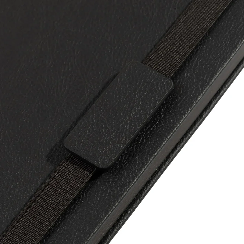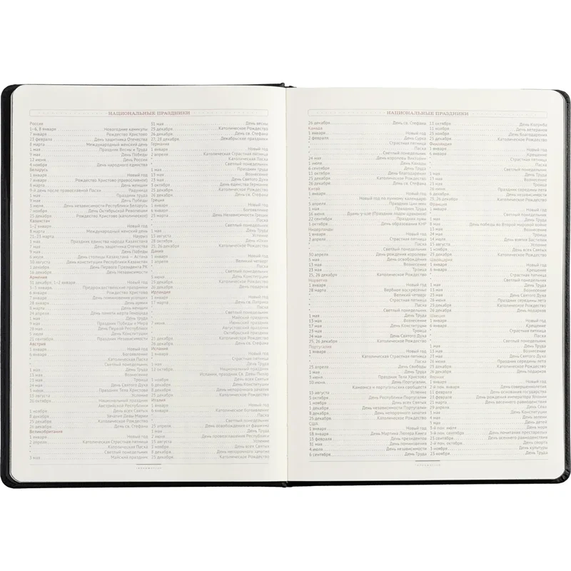 Ежедневник формата В5 (17×24 см) в классическом чёрном цвете сочетает в себе элегантность и практичность. Твёрдая обложка выполнена из искусственной кожи с выраженным рельефом, имитирующим натуральную кожу, что придаёт ему износоустойчивость и стильный внешний вид. Закруглённые углы и тонированный чёрный обрез добавляют модели уникальности. Эффектная фиксирующая резинка с бегунком, подобранная в тон обложке, не позволяет ежедневнику случайно раскрыться.