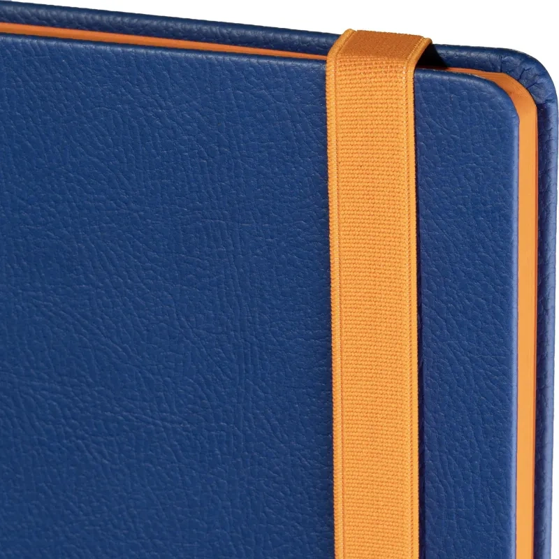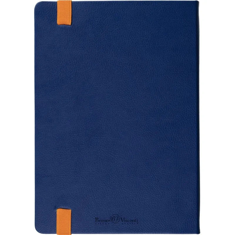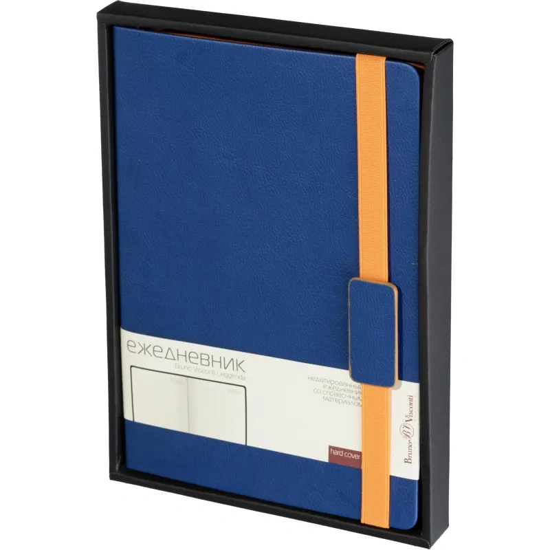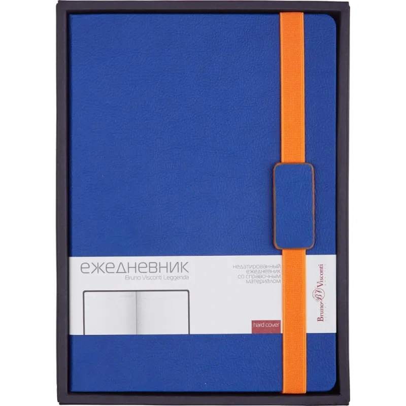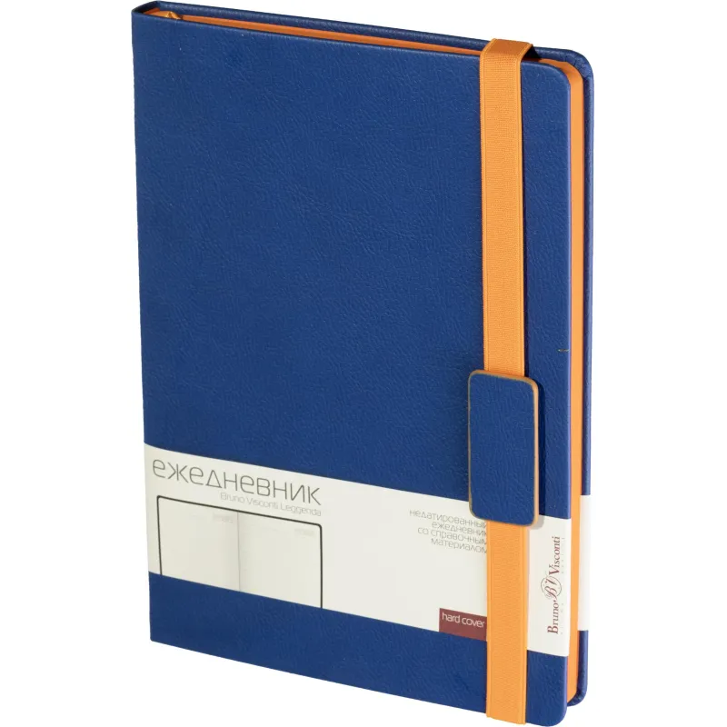 Ежедневник недатированный Bruno Visconti Leggenda — искусственная кожа B5 136 листов синий (оранжевый обрез). Ежедневник с твёрдой обложкой из искусственной кожи синего цвета из коллекции Leggenda — элегантный и функциональный аксессуар для деловых людей, особенно удобный для настольного использования. Обложка выполнена из качественного материала с выраженным рельефом, имитирующим натуральную кожу. Широкая резинка с термостойким бегунком позволяет персонализировать ежедневник.