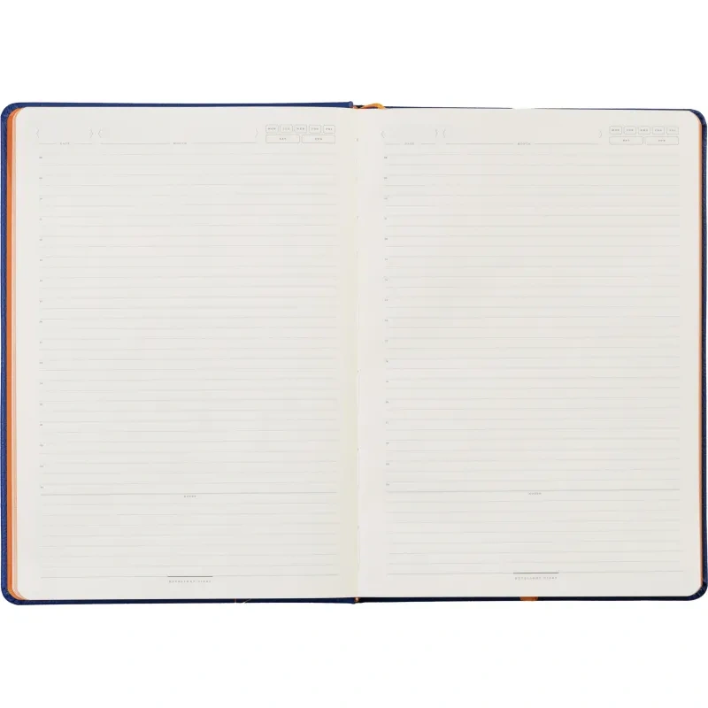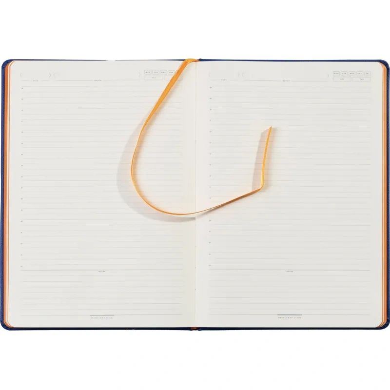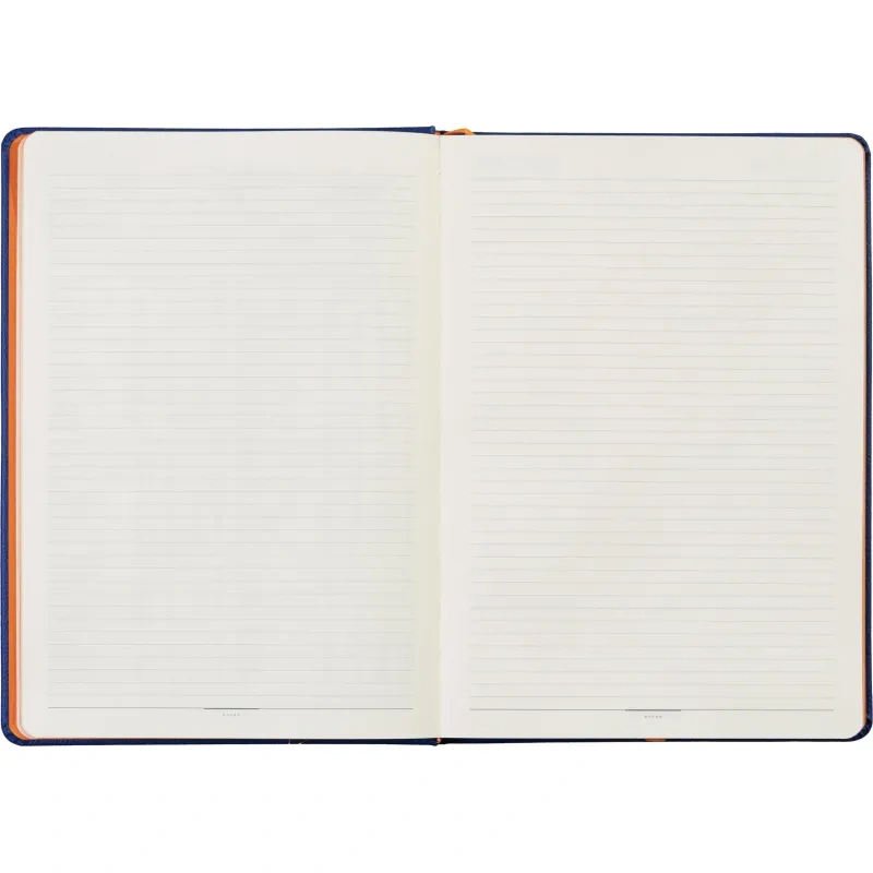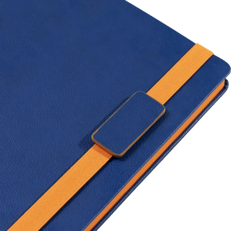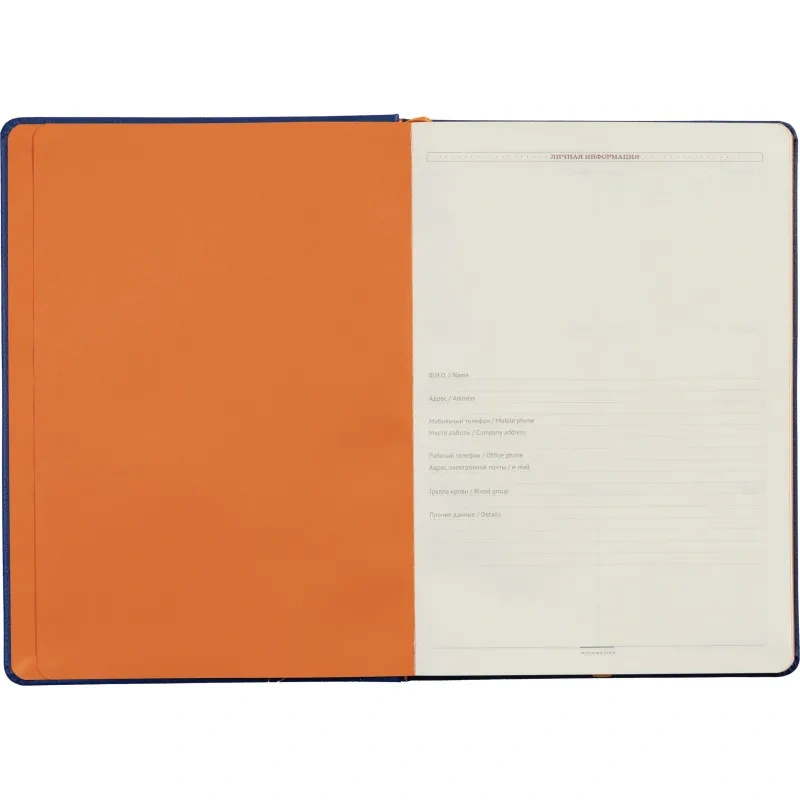 Ежедневник недатированный Bruno Visconti Leggenda — искусственная кожа B5 136 листов синий (оранжевый обрез). Ежедневник с твёрдой обложкой из искусственной кожи синего цвета из коллекции Leggenda — элегантный и функциональный аксессуар для деловых людей, особенно удобный для настольного использования. Обложка выполнена из качественного материала с выраженным рельефом, имитирующим натуральную кожу. Широкая резинка с термостойким бегунком позволяет персонализировать ежедневник.