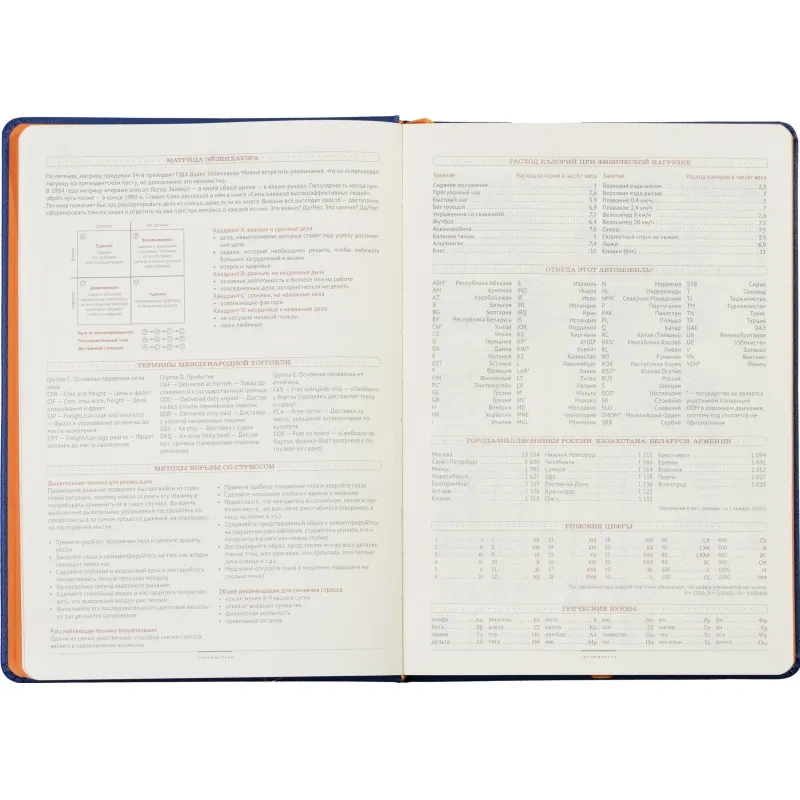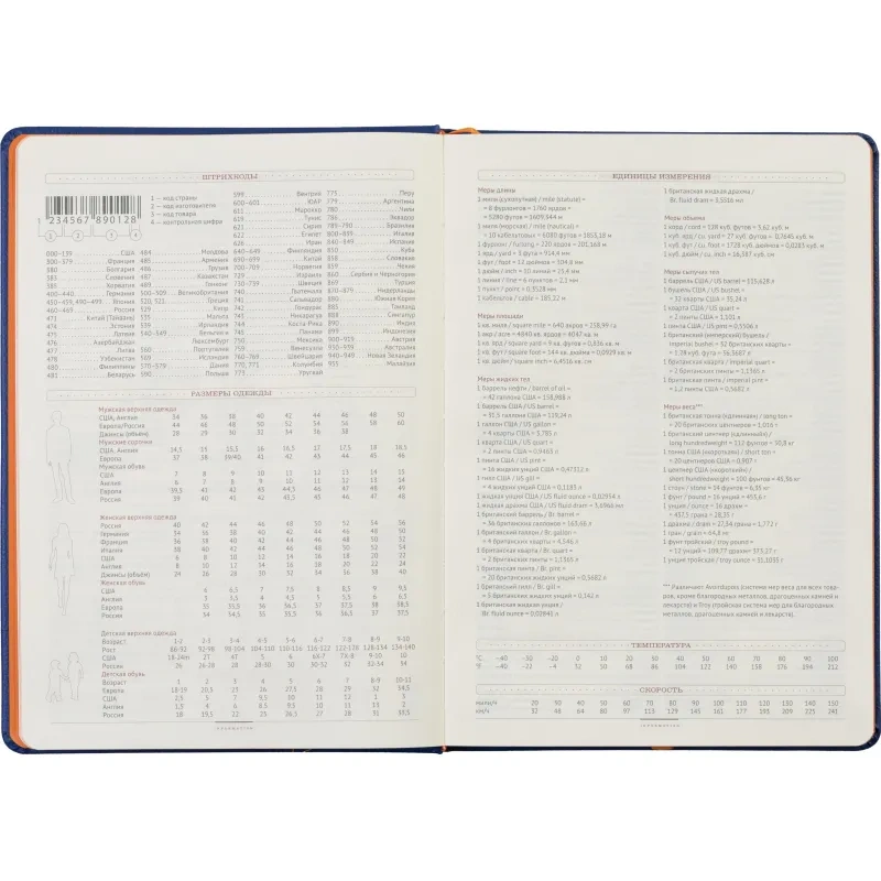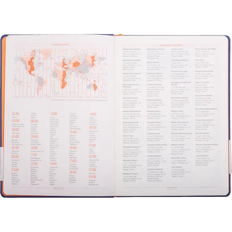 Справочная информация на первых страницах охватывает полезные данные, такие как личные данные, часовые пояса, аэропорты Европы, телефонные коды, размеры одежды, автомобильные коды и другие важные сведения. Также предусмотрено поле для заметок.