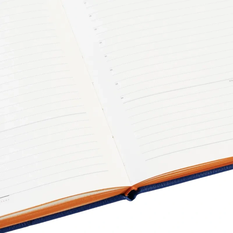 Внутренний блок состоит из 136 листов (272 страницы) бежевой офсетной бумаги плотностью 90 г/кв.м., с ляссе и закруглёнными углами. Листы линейкой, что делает записи аккуратными и организованными. Блок недатированный, что даёт возможность начать использовать ежедневник в любой день года.