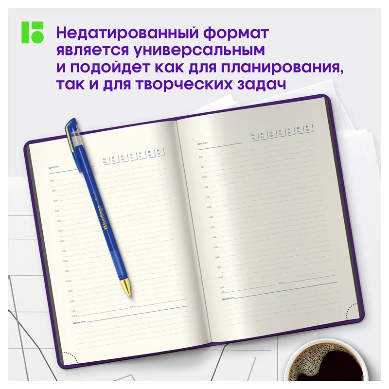 Стильный недатированный ежедневник Berlingo Color Zone формата А5 с ультрамягкой обложкой из экокожи. Обложка с тиснением фиолетового цвета ярко контрастирует с черным срезом. Для удобства внутри корешка расположен специальный карман для ручки, ежедневник можно зафиксировать вертикальной резинкой. Внутренний блок состоит из 136 листов высококачественной кремовой бумаги повышенной плотности 80 г/м? с пантонной печатью в 2 краски. Недатированный ежедневник Berlingo Color Zone представлен в размере 143 на 210 мм.