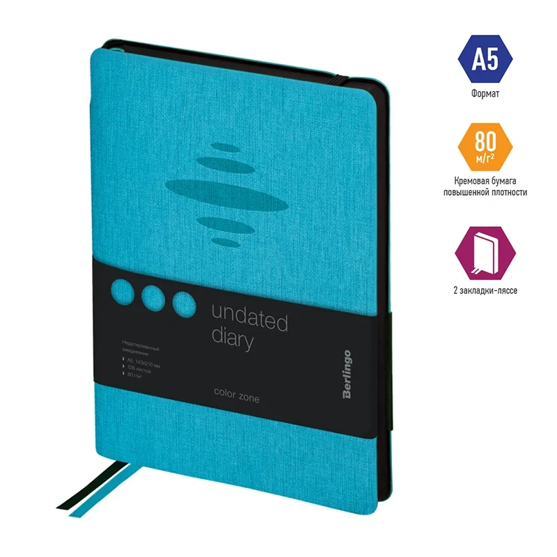 Стильный недатированный ежедневник Berlingo Color Zone формата А5 с ультрамягкой обложкой из экокожи. Голубой цвет обложки ярко контрастирует с черным срезом и сочетается со стильным тиснением. Для удобства внутри корешка расположен специальный карман для ручки, ежедневник можно зафиксировать вертикальной резинкой. Внутренний блок состоит из 136 листов высококачественной кремовой бумаги повышенной плотности 80 г/м? с пантонной печатью в 2 краски. Недатированный ежедневник Berlingo Color Zone представлен в размере 143 на 210 мм.
