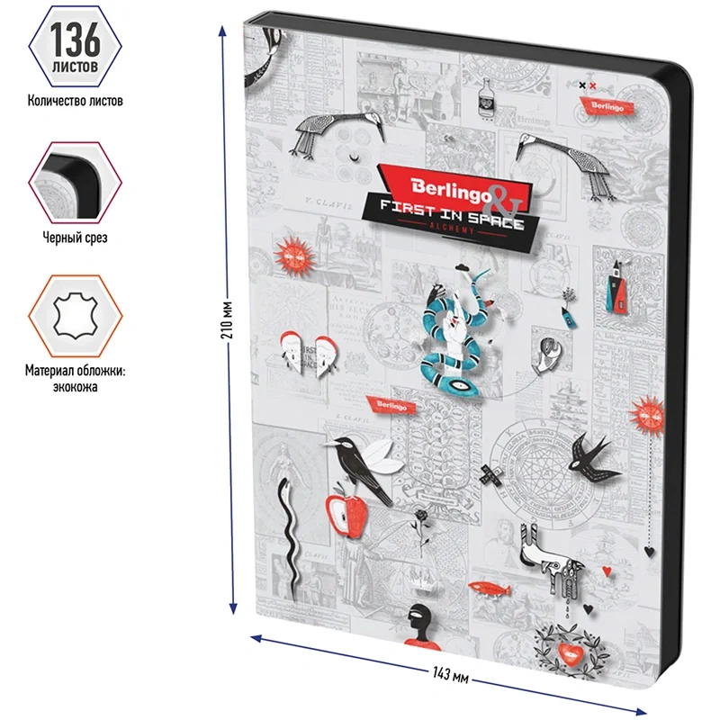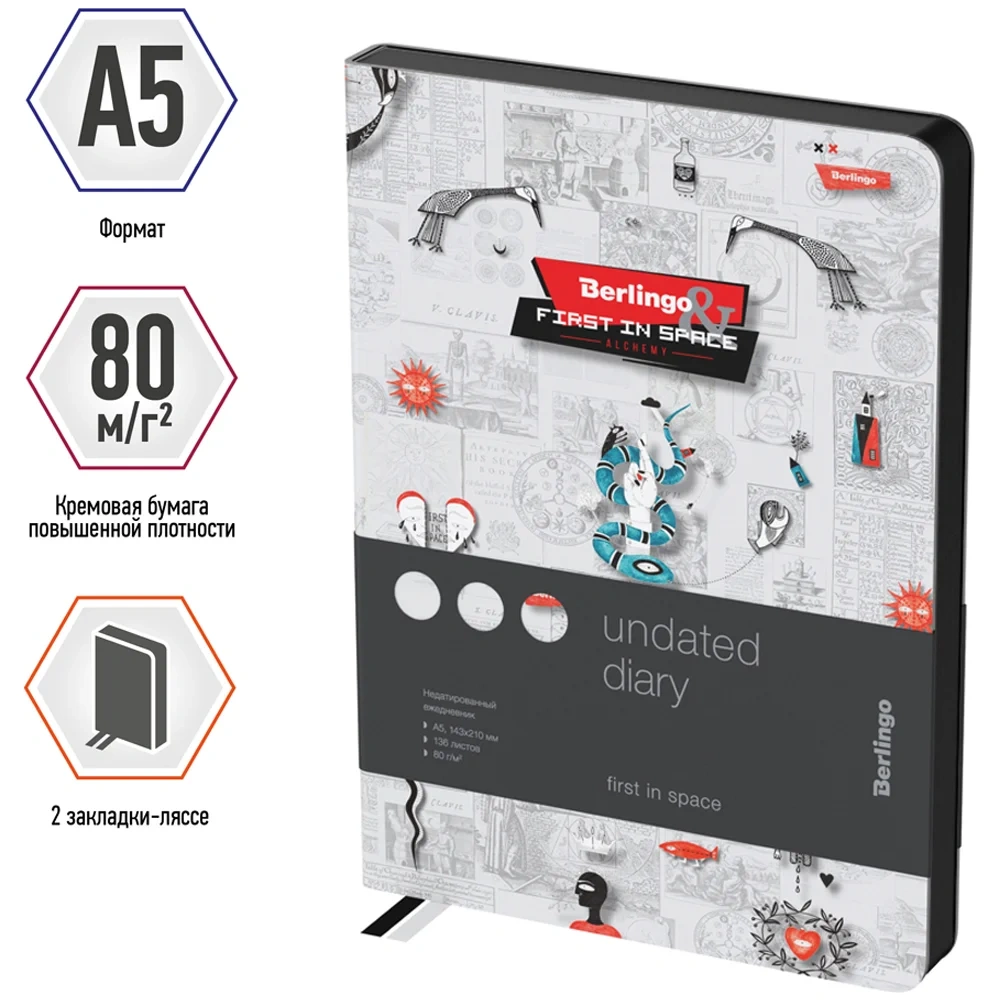 Стильный недатированный ежедневник Berlingo First in Space формата A5 с черным контрастным срезом и ультрамягкой обложкой из высококачественной экокожи. Яркий дизайн в коллаборации с модным брендом одежды First in Space. Внутренний блок состоит из 136 листов высококачественной кремовой бумаги повышенной плотности 80 г/м? с пантонной печатью в 2 краски. Представлен в размере 143 на 210 мм.
